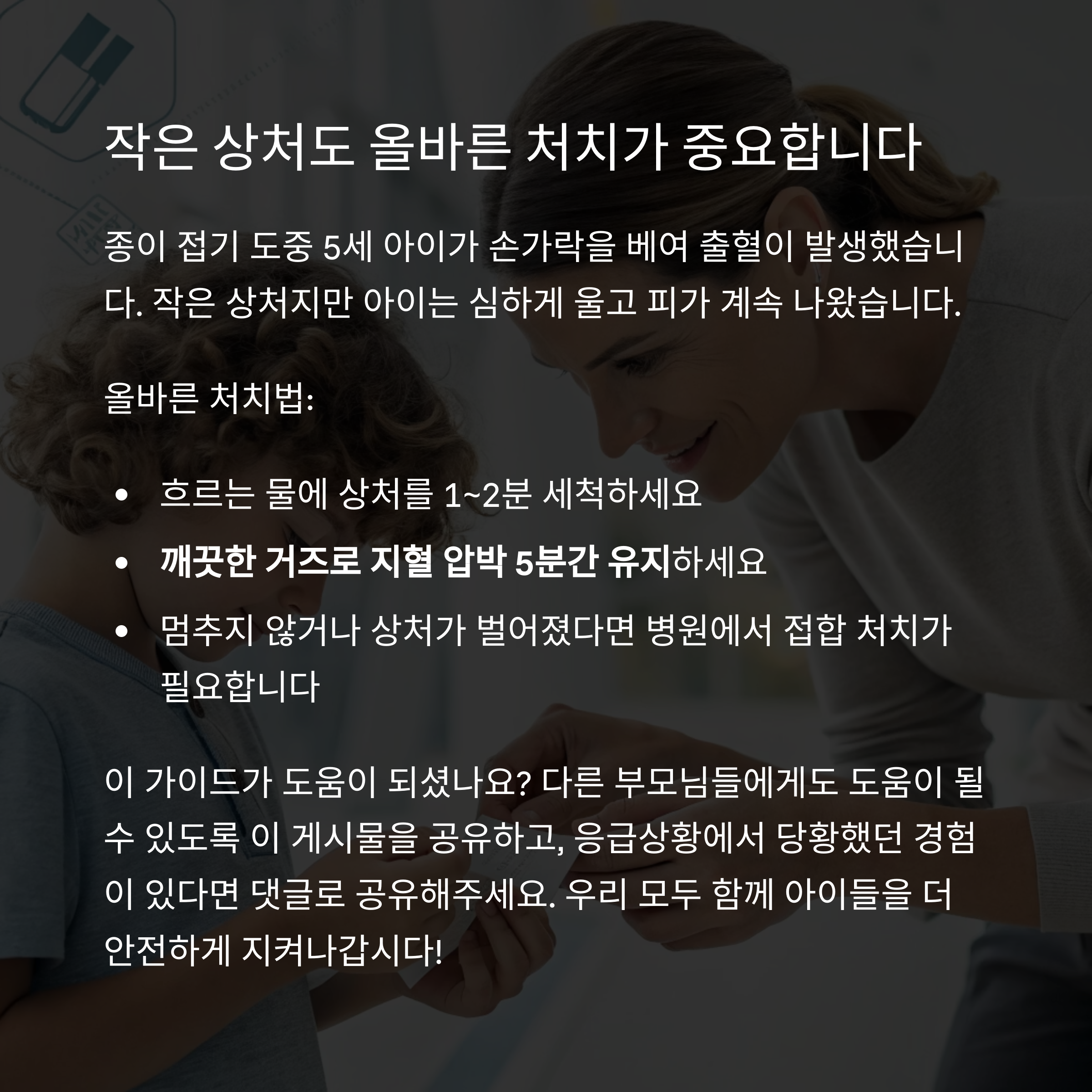 상황: 종이 접기 도중 5세 아이가 손가락을 베여 출혈이 발생했습니다.