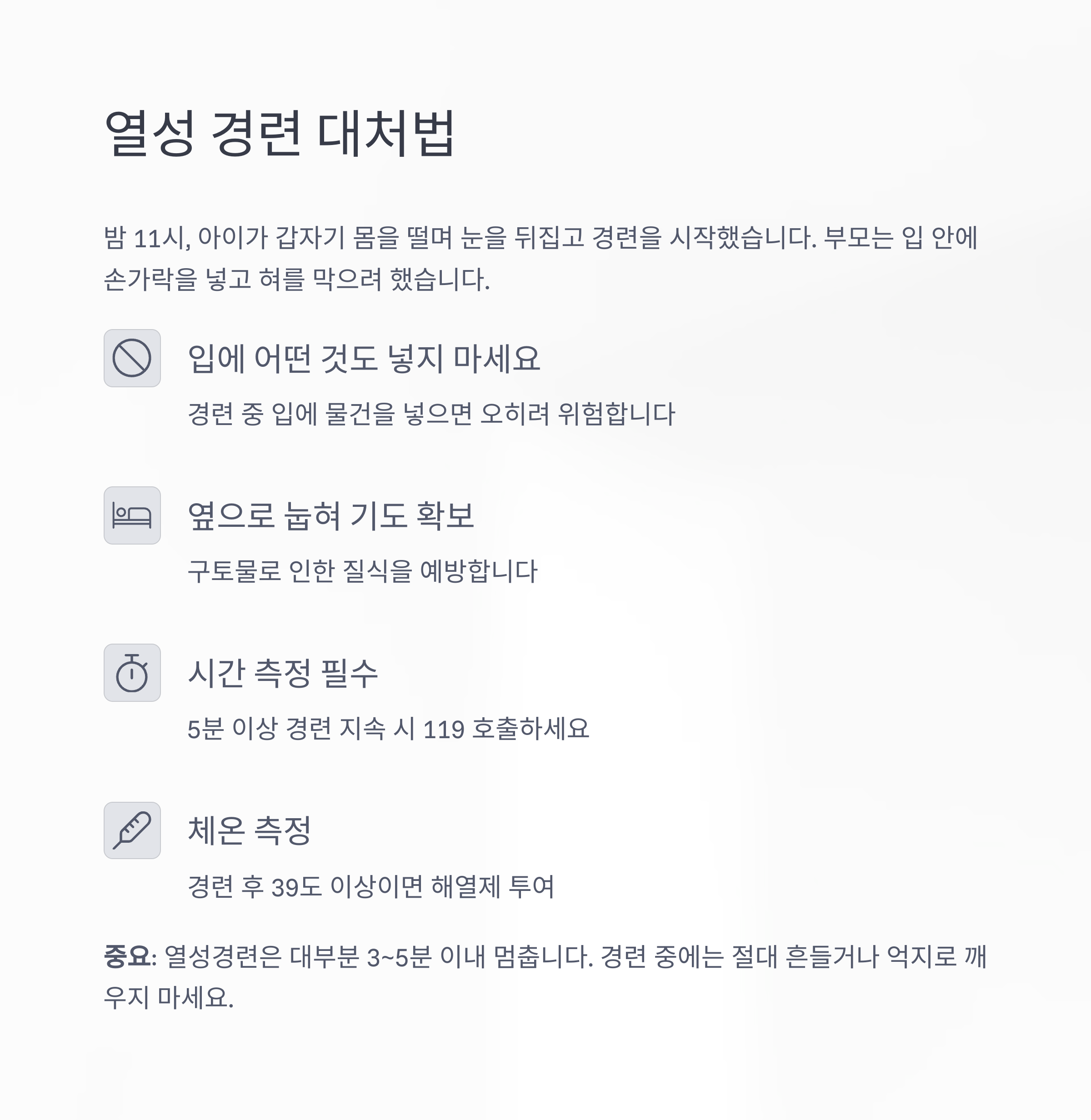 중요: 열성경련은 대부분 3~5분 이내 멈춥니다.