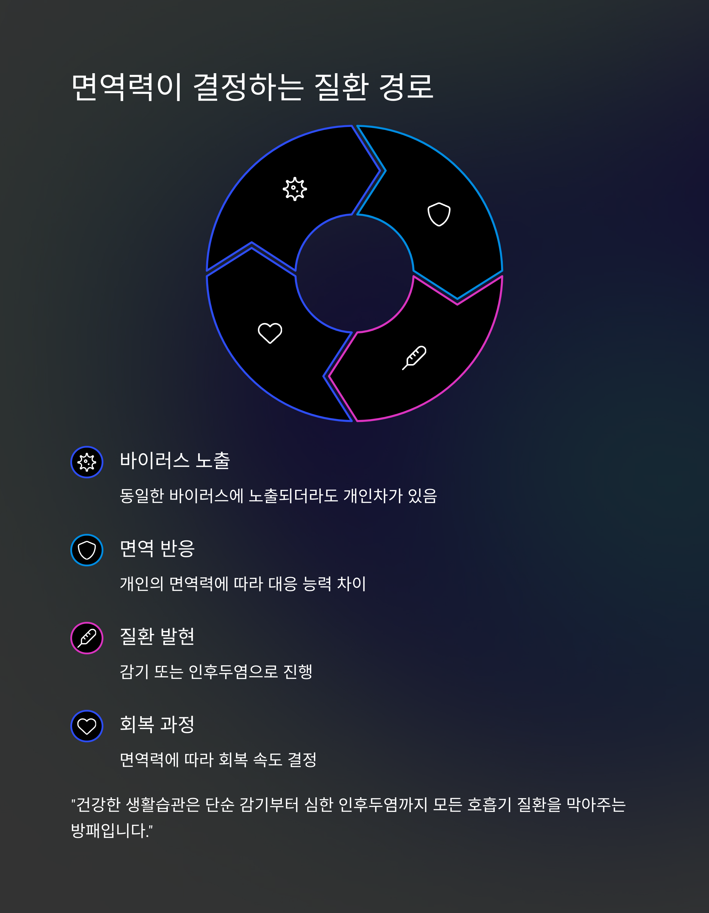 "건강한 생활습관은 단순 감기부터 심한 인후두염까지 모든 호흡기 질환을 막아주는 방패입니다."