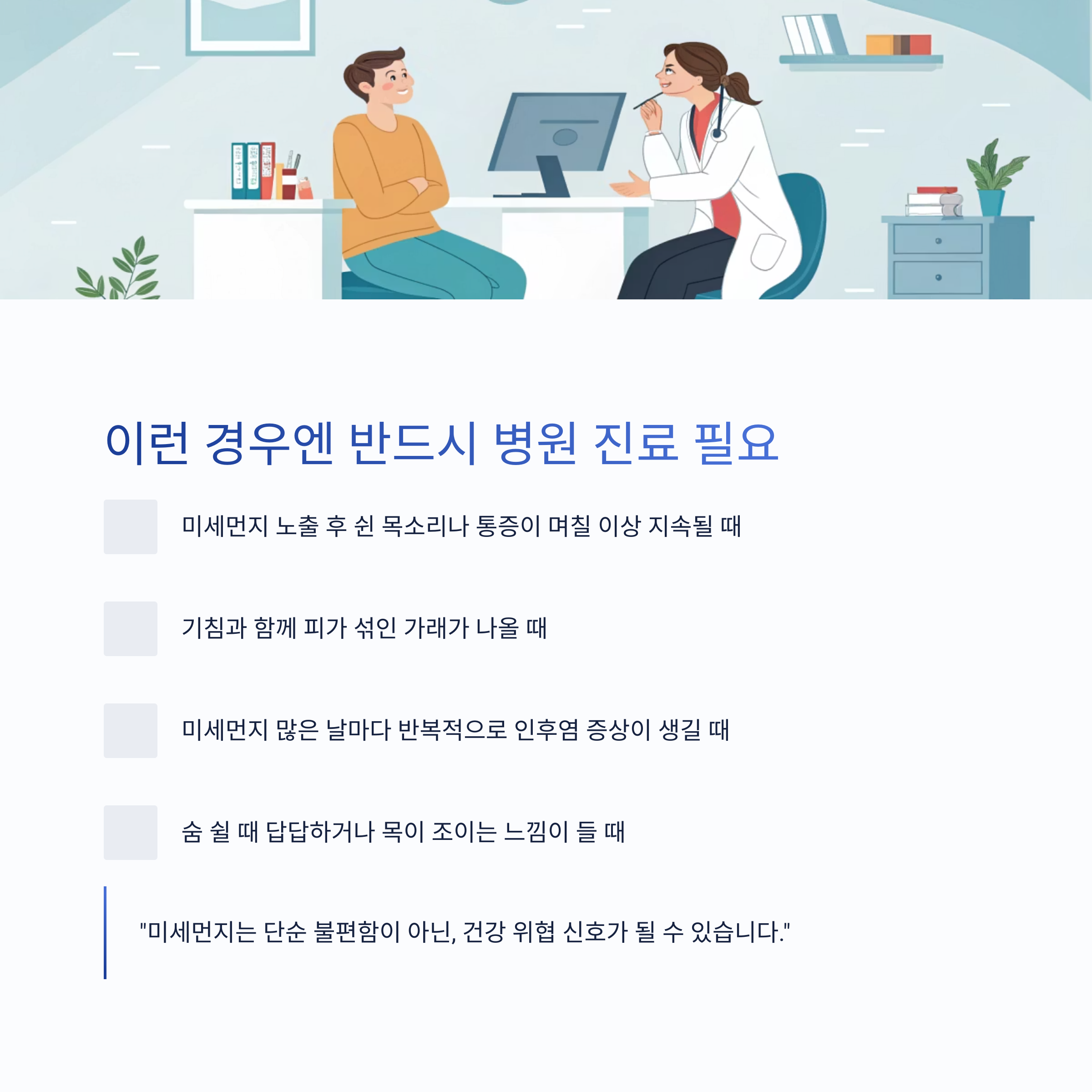 - 미세먼지 노출 후 쉰 목소리나 통증이 며칠 이상 지속될 때