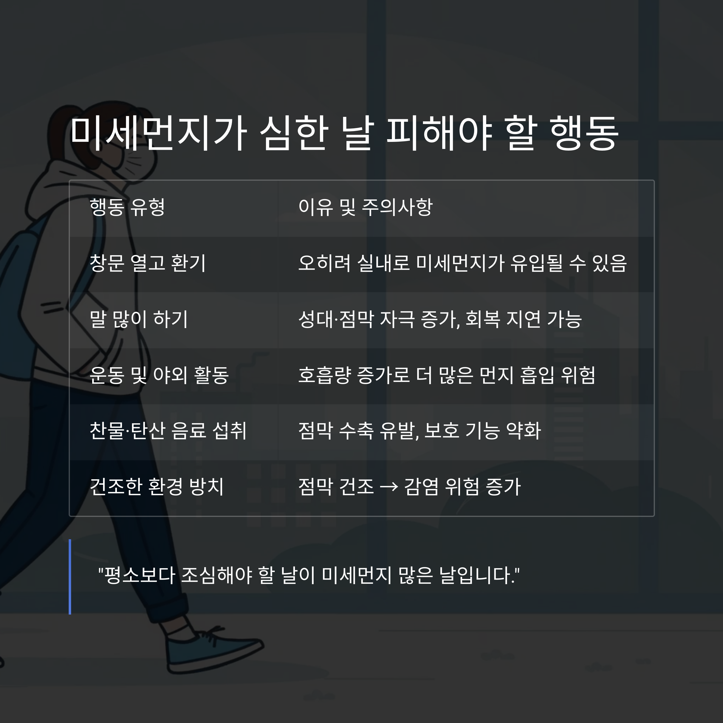 | 운동 및 야외 활동 | 호흡량 증가로 더 많은 먼지 흡입 위험 |