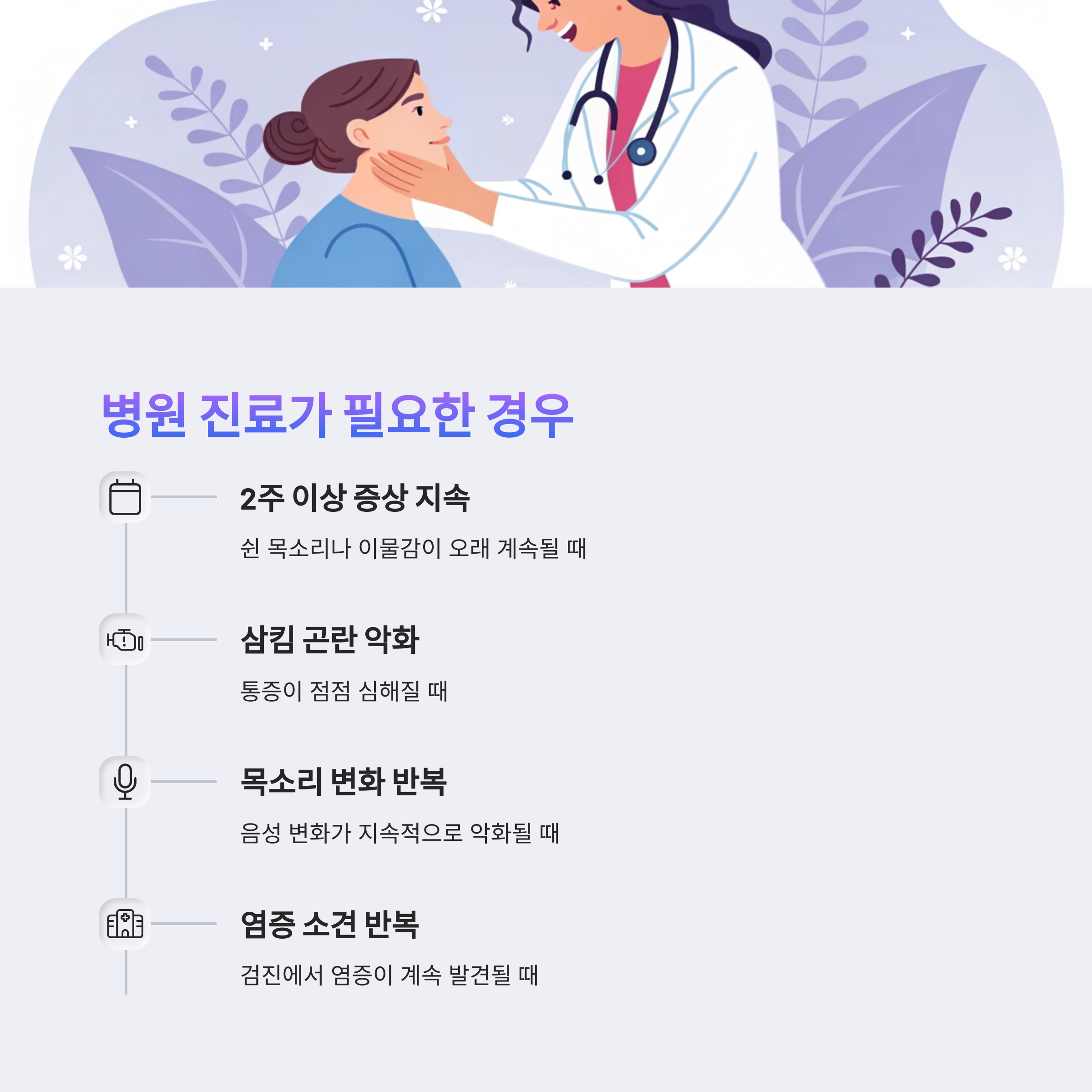 스트레스로 인한 인후 증상이라도 다음과 같은 상태라면 반드시 진료가 필요합니다.