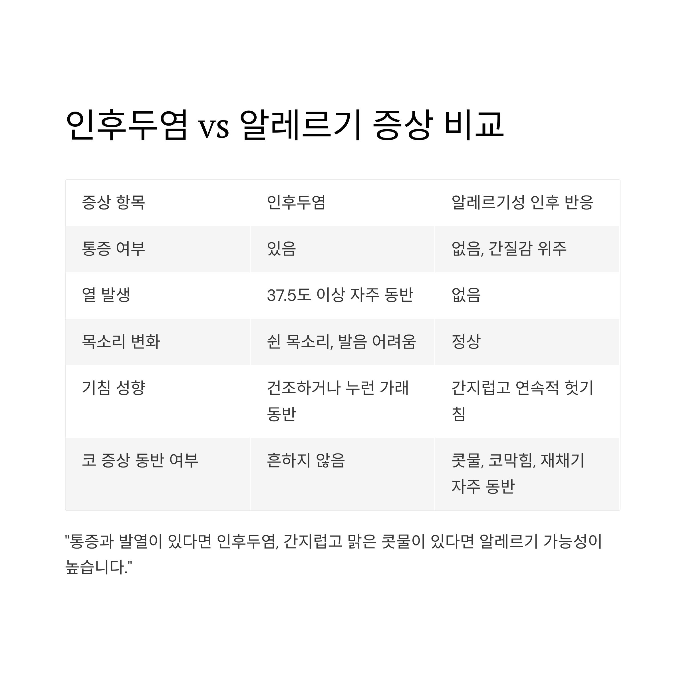| 주요 증상 | 인후통, 발열, 쉰 목소리, 침 삼킬 때 통증 | 목 간지러움, 연속 기침, 콧물 동반 |