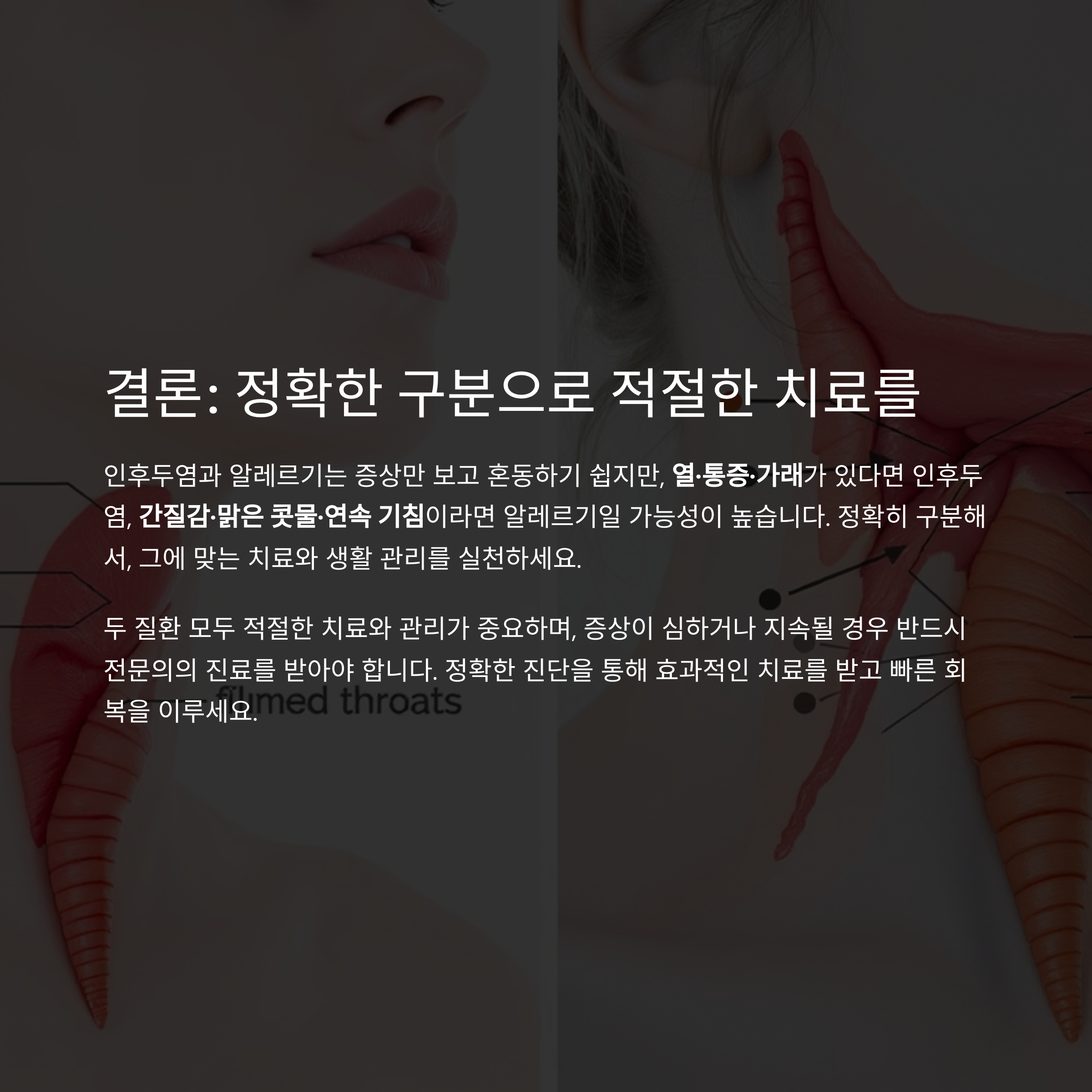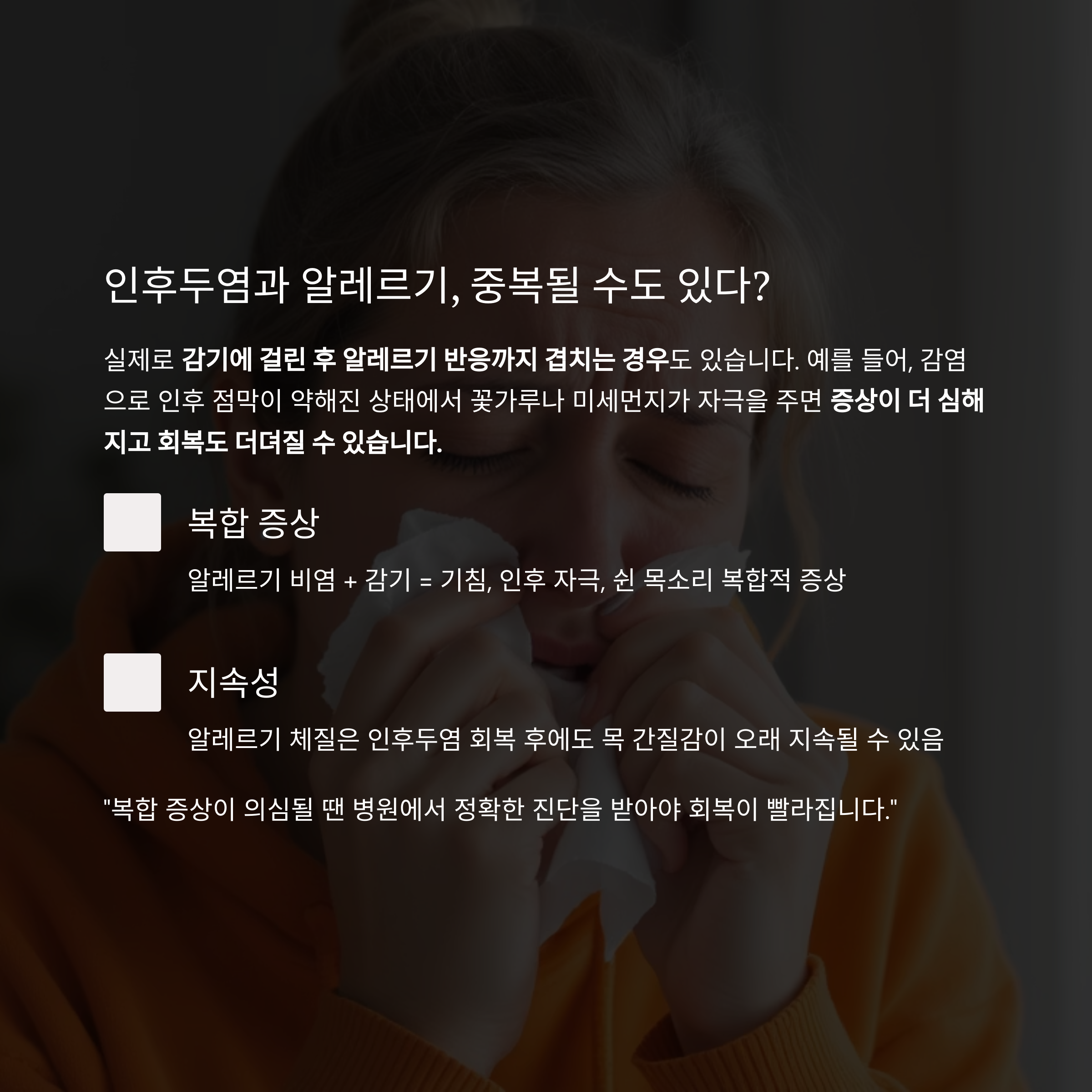 - 알레르기 체질은 인후두염 회복 후에도 목 간질감이 오래 지속될 수 있음