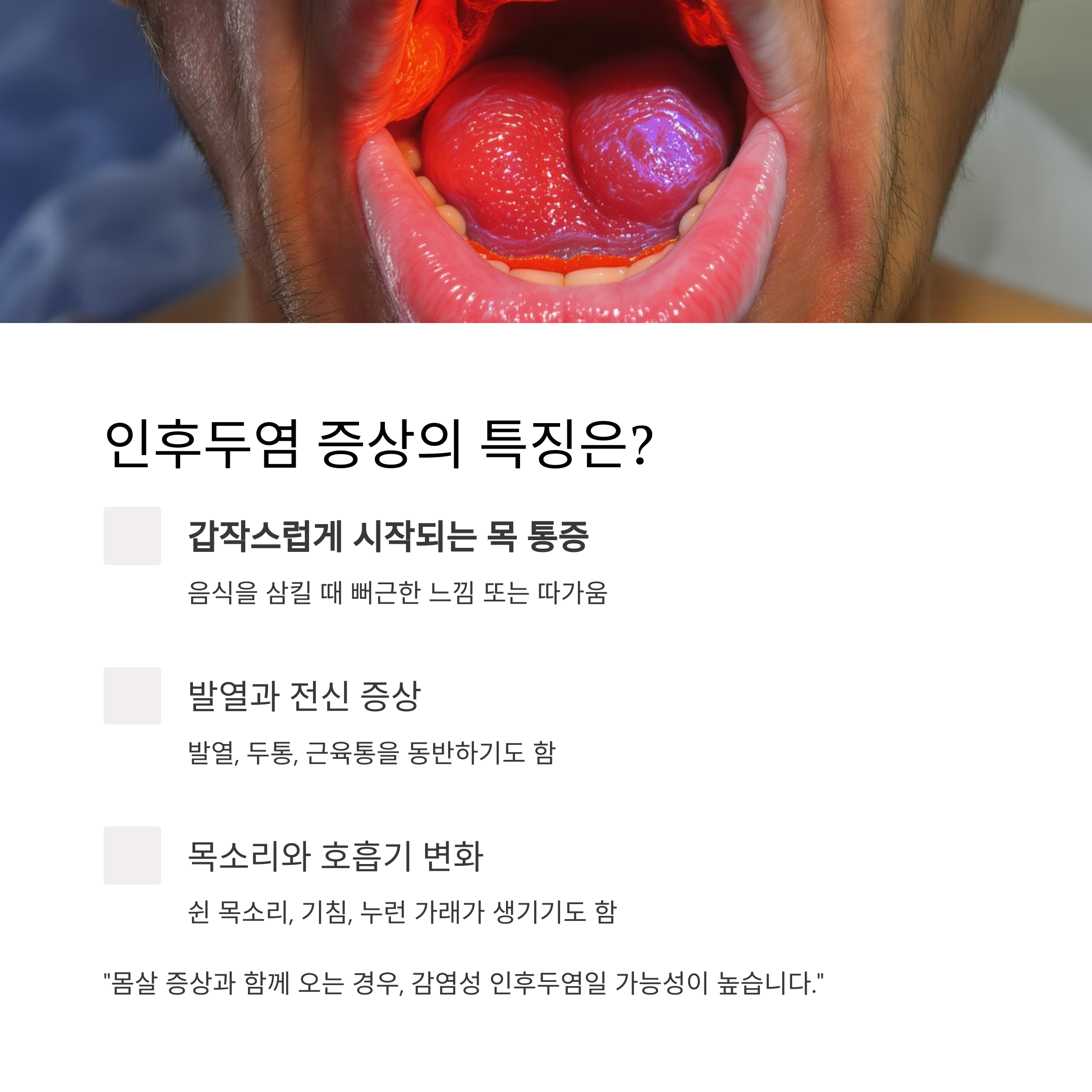 "몸살 증상과 함께 오는 경우, 감염성 인후두염일 가능성이 높습니다."