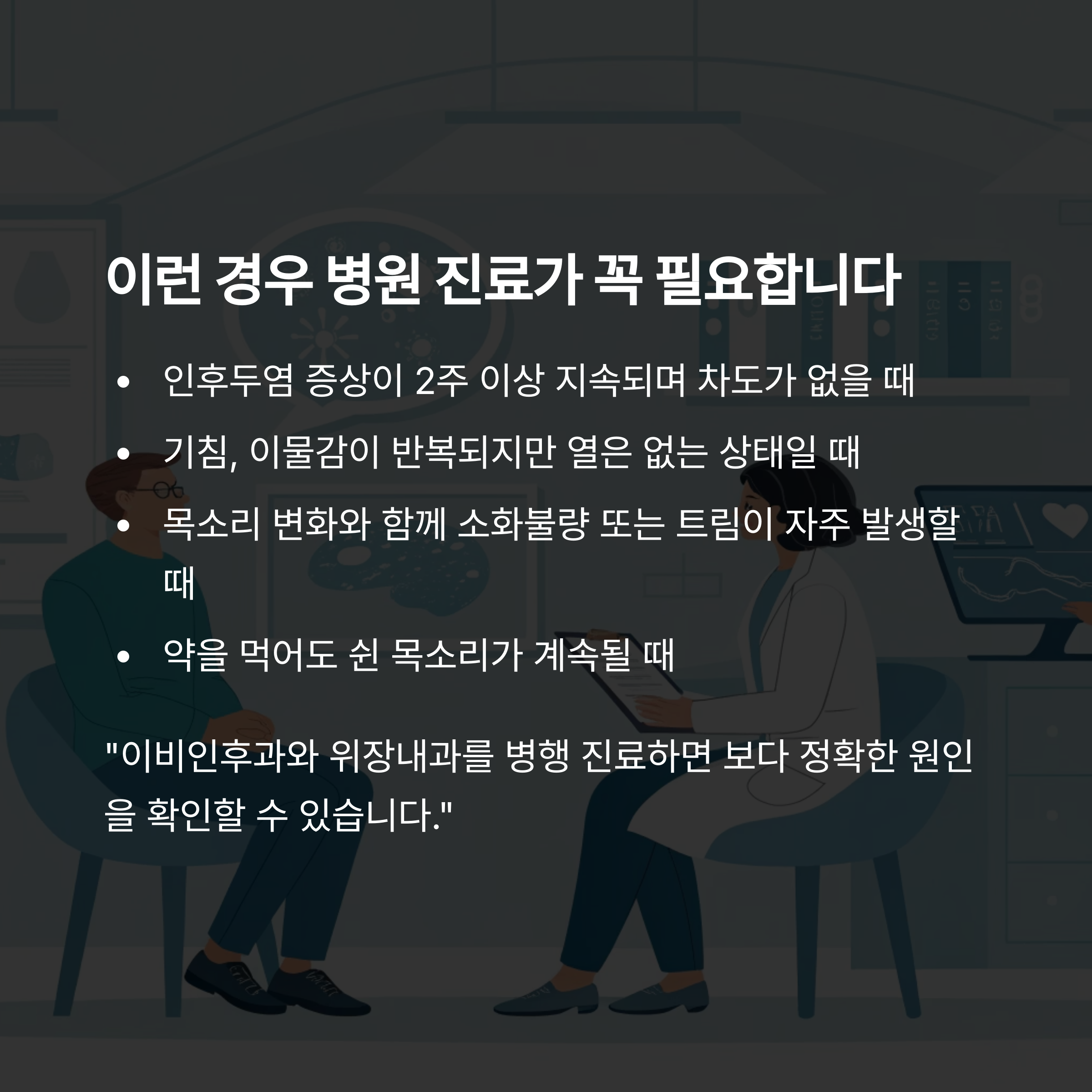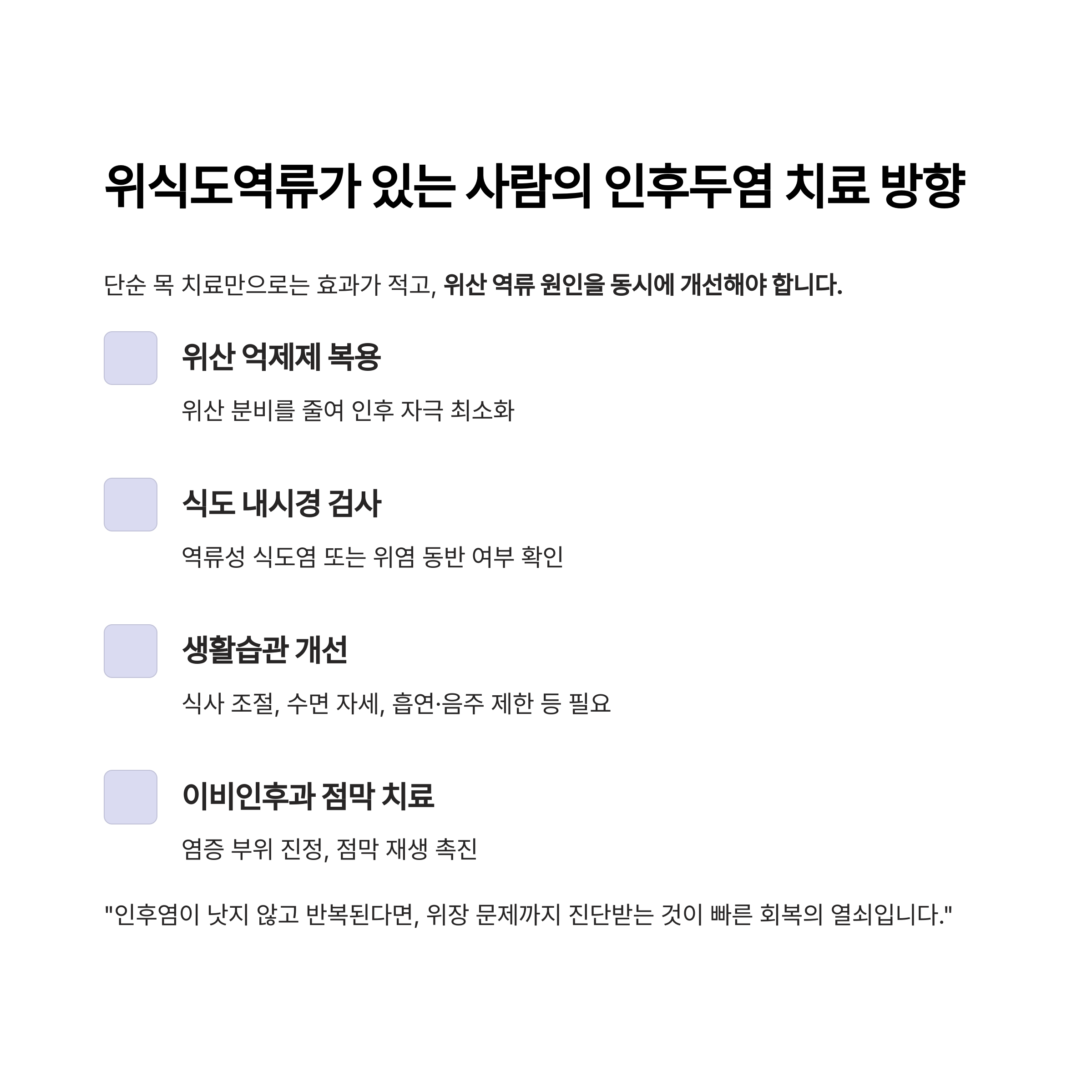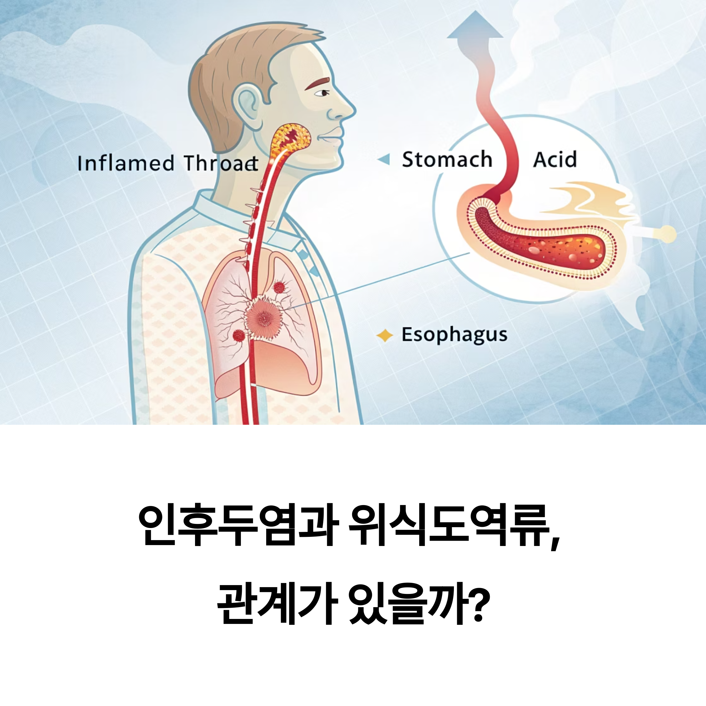 "인후염이 낫지 않고 반복된다면, 위장 문제까지 진단받는 것이 빠른 회복의 열쇠입니다."