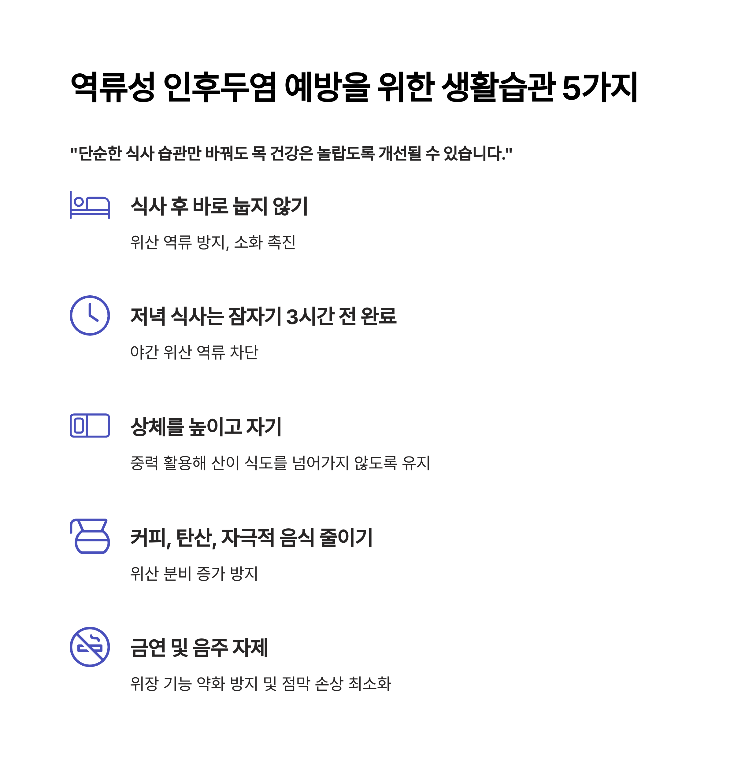 | 저녁 식사는 잠자기 3시간 전 완료 | 야간 위산 역류 차단 |