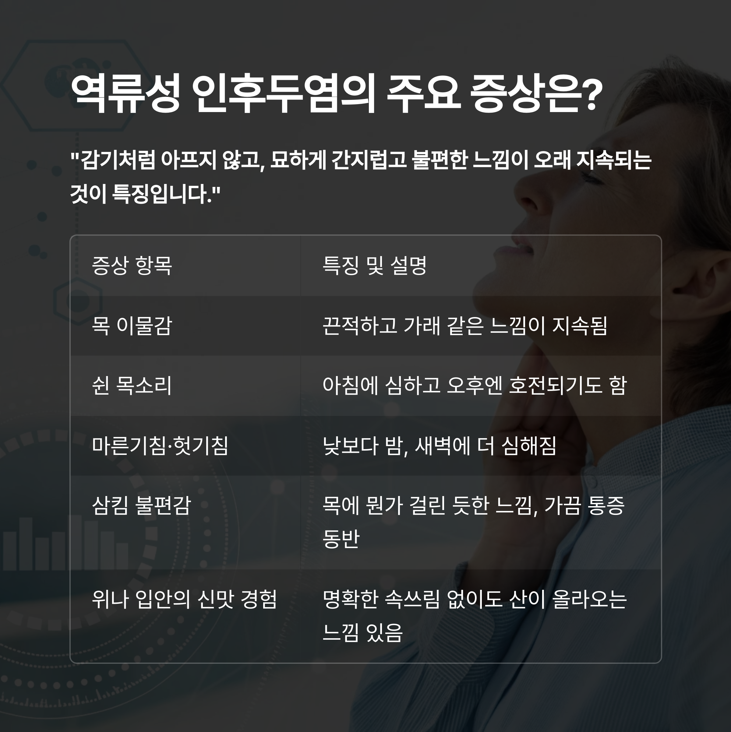 "열 없이 반복되는 인후 통증과 이물감이 있다면, 위산 역류를 의심해볼 필요가 있습니다."