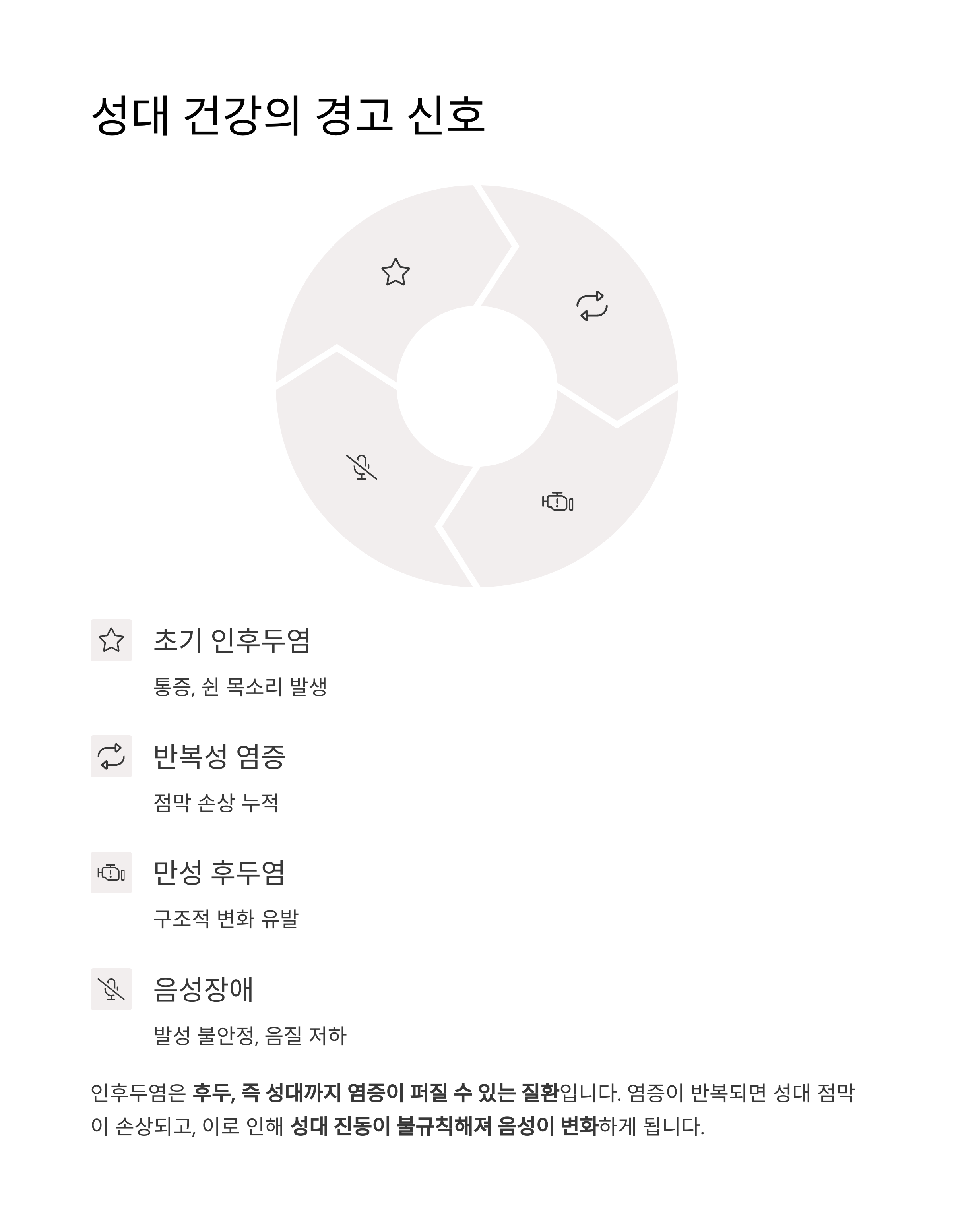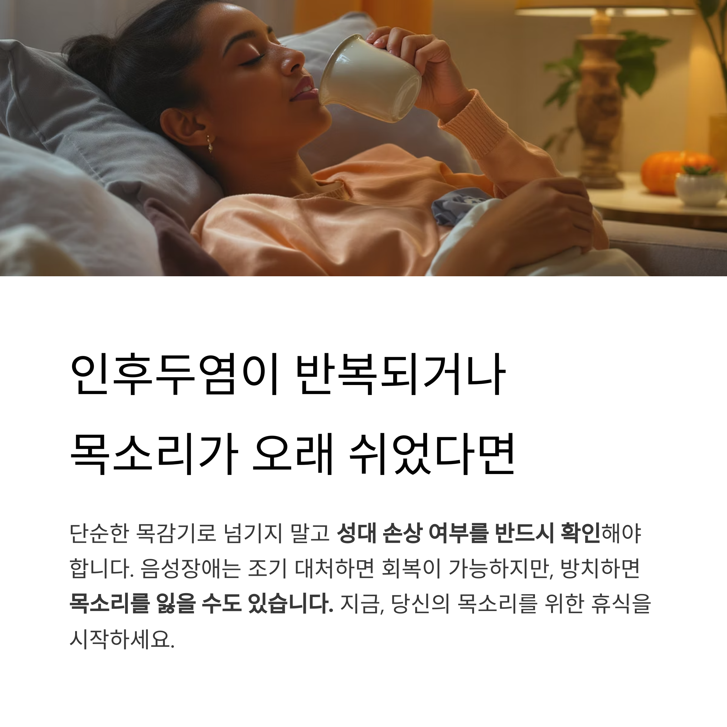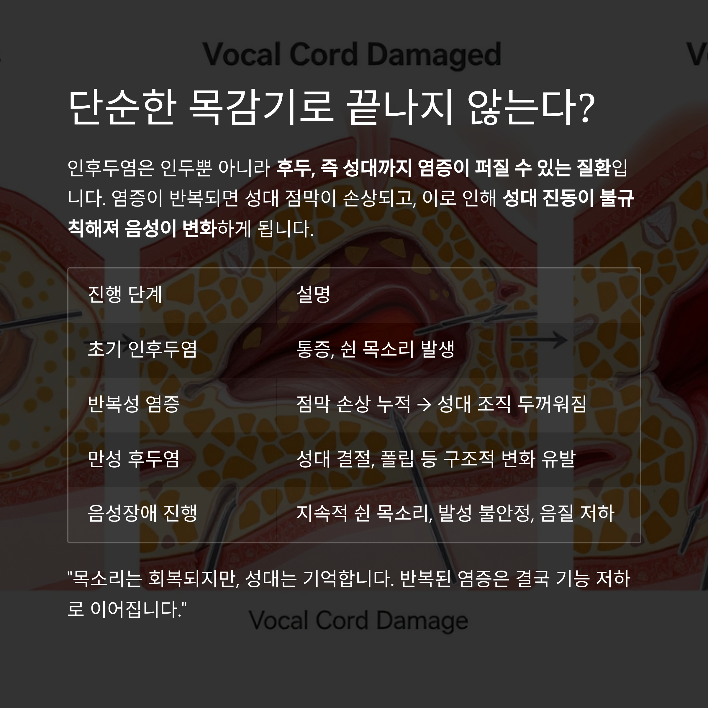 "목소리는 회복되지만, 성대는 기억합니다. 반복된 염증은 결국 기능 저하로 이어집니다."