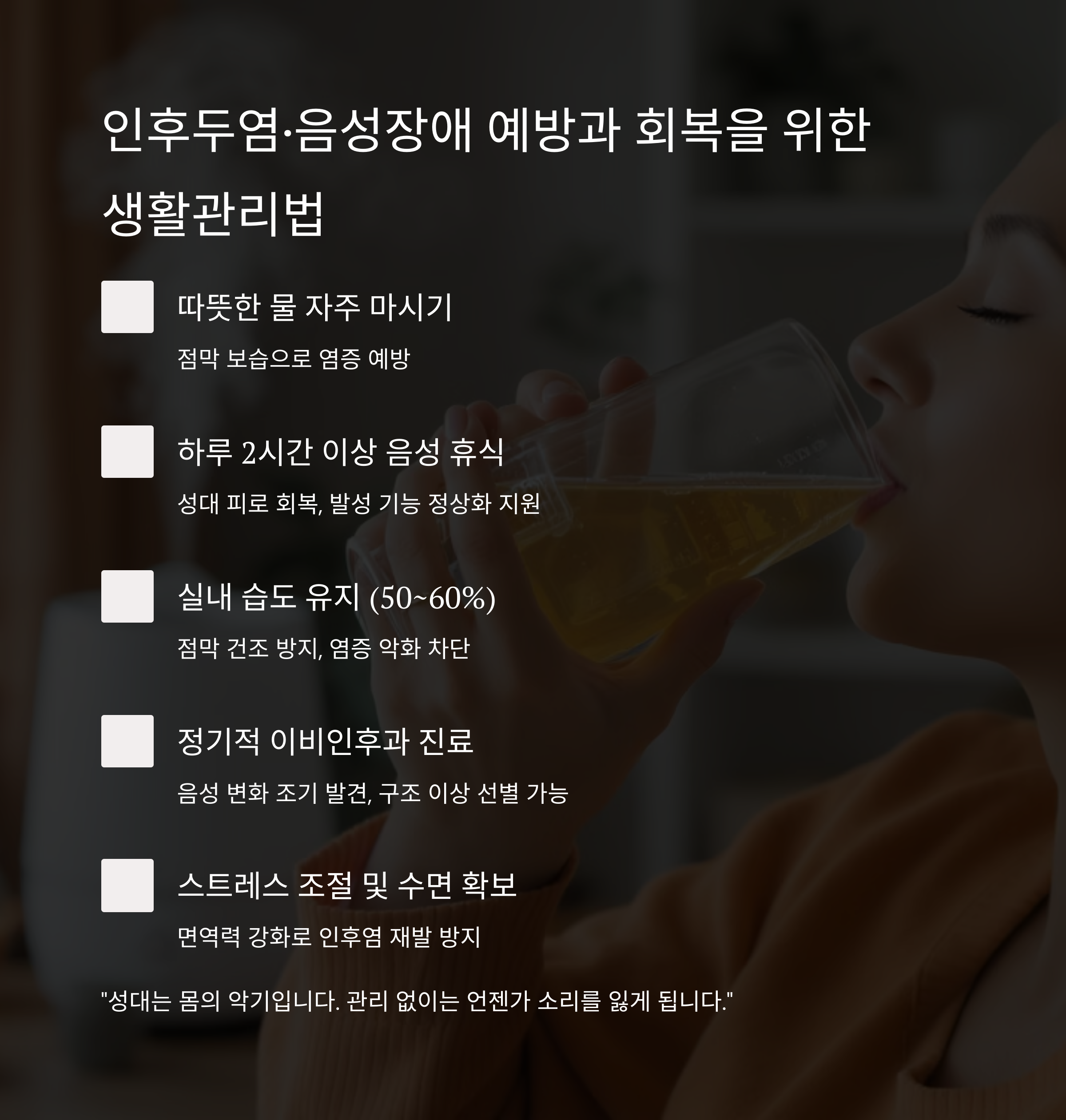"특히 직업적으로 목소리를 쓰는 사람이라면 이 증상들을 절대 가볍게 넘겨선 안 됩니다."