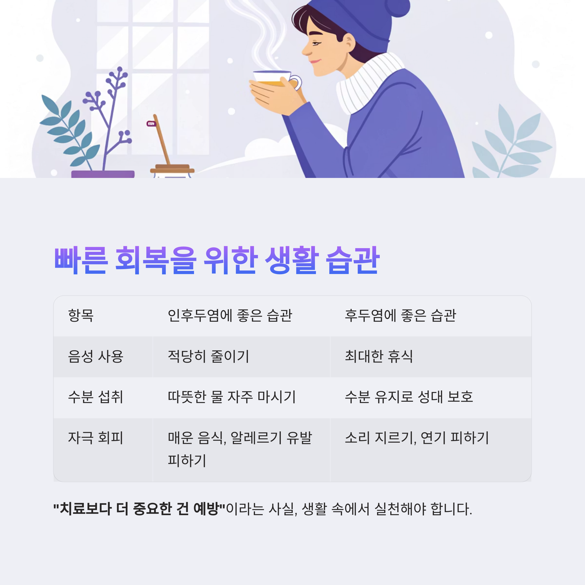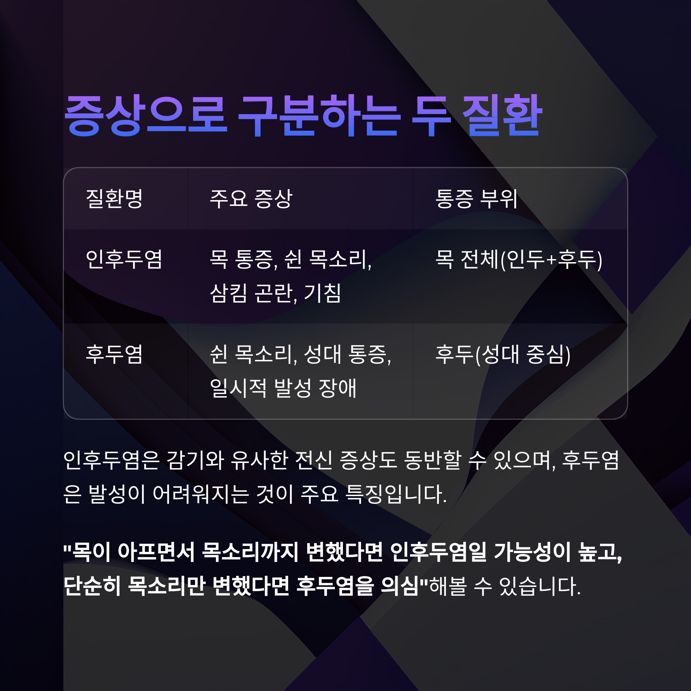 "감염이 주된 원인인 인후두염과, 자극에 의한 후두염은 치료 방향도 달라질 수 있습니다."