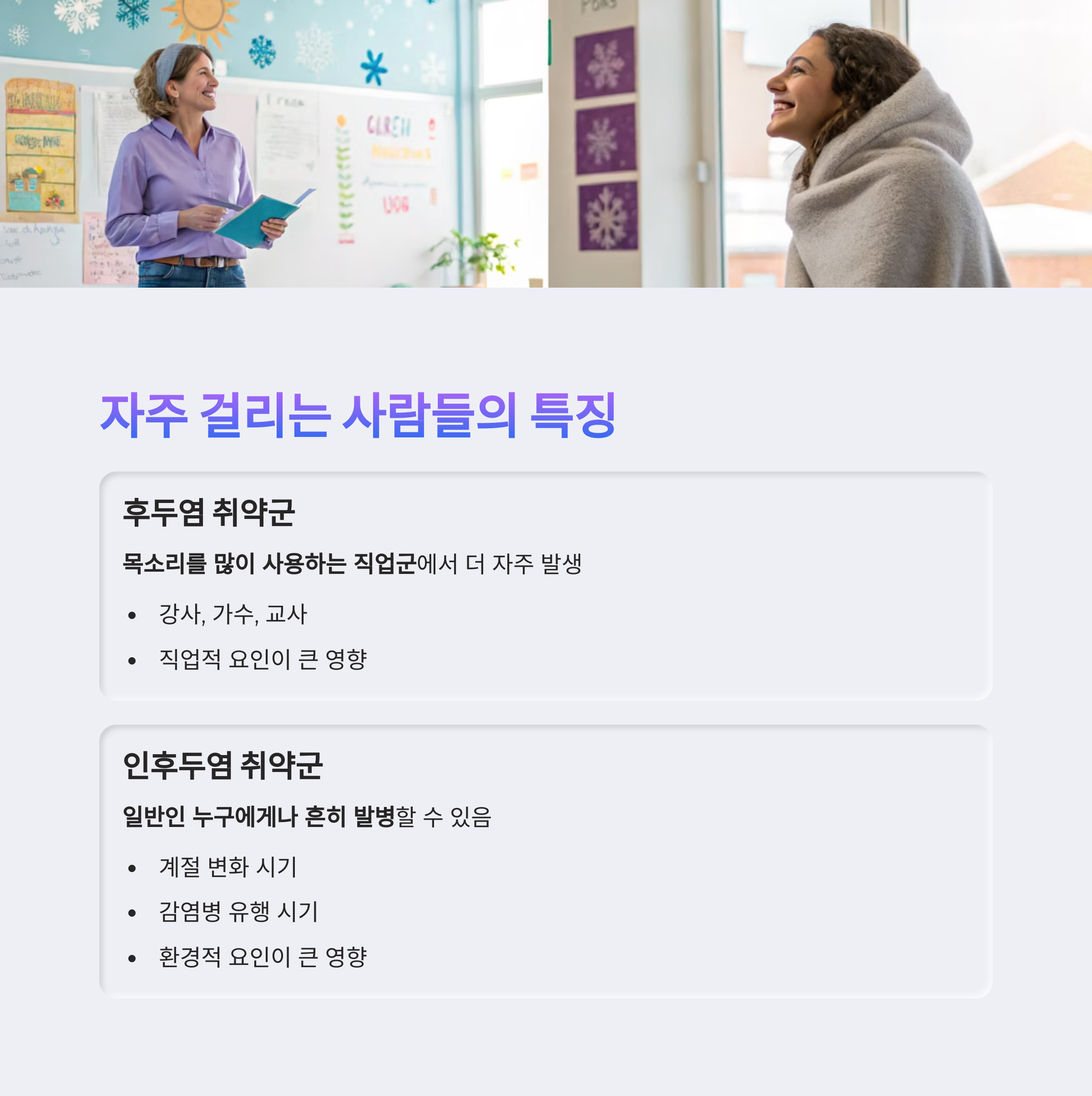 인후두염은 계절 변화나 감염병 유행 시기에 일반인 누구에게나 흔히 발병할 수 있습니다.