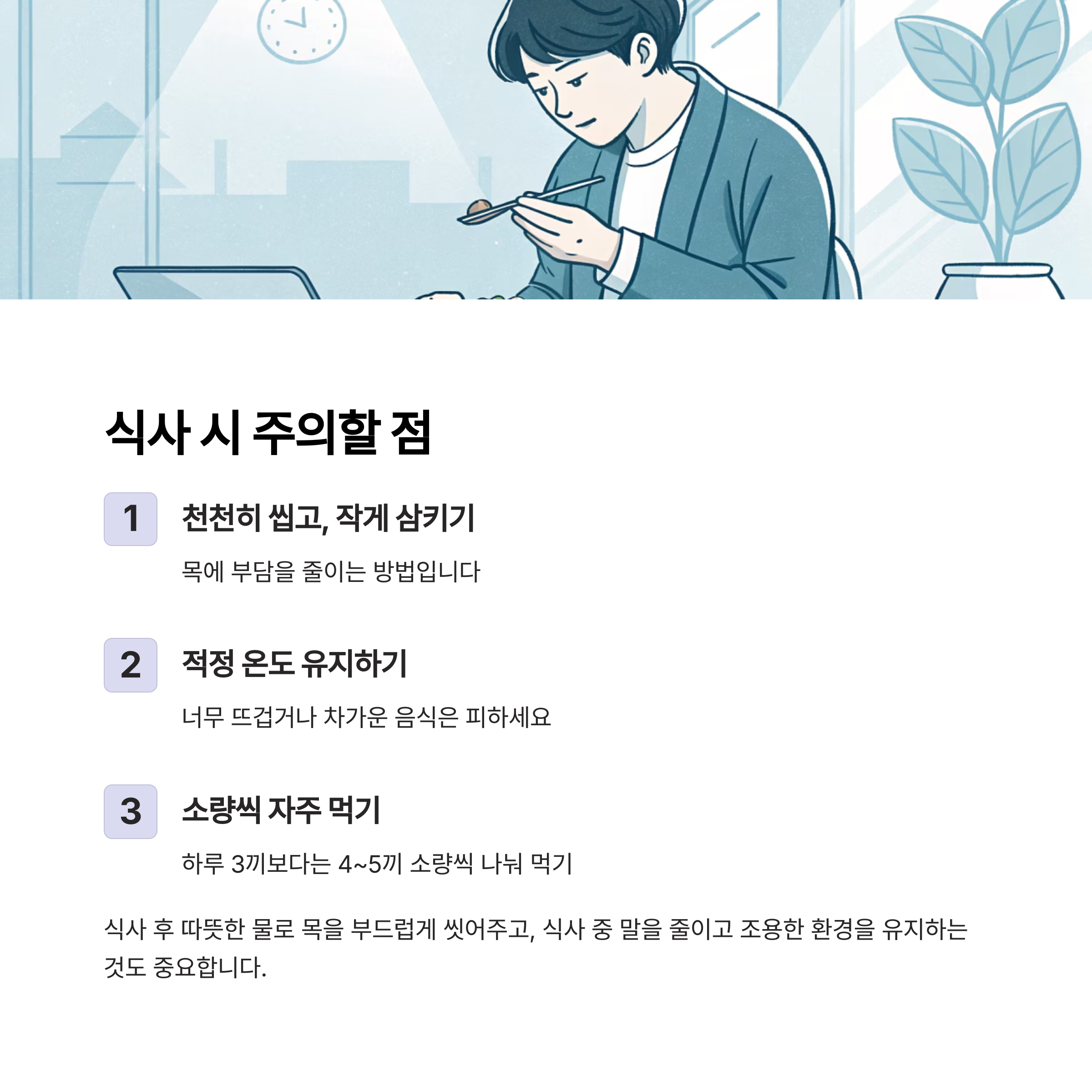 그리고 식사 시 주의할 점까지 구체적으로 정리해드립니다.
