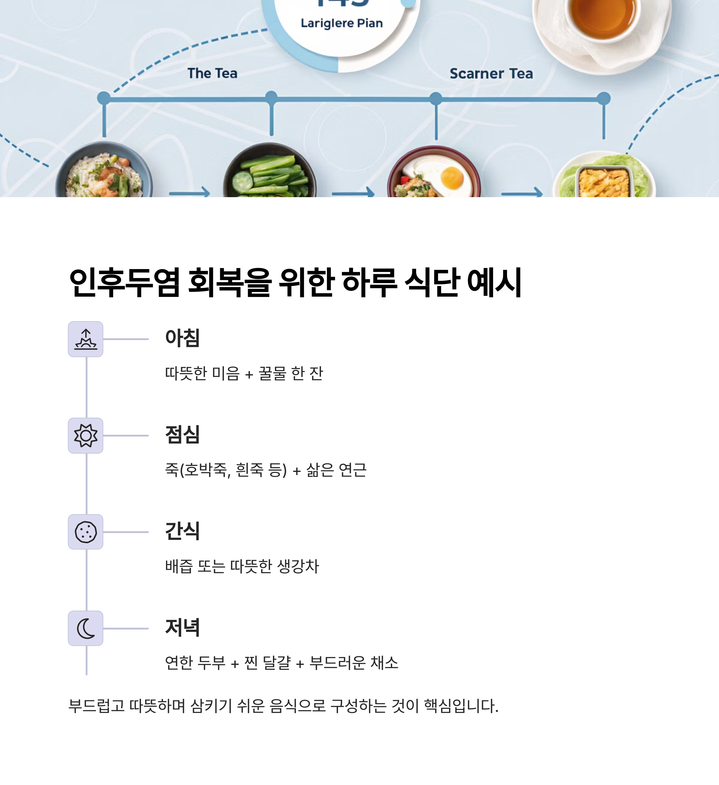 하루 식단 예시: 인후두염 회복을 위한 음식 구성