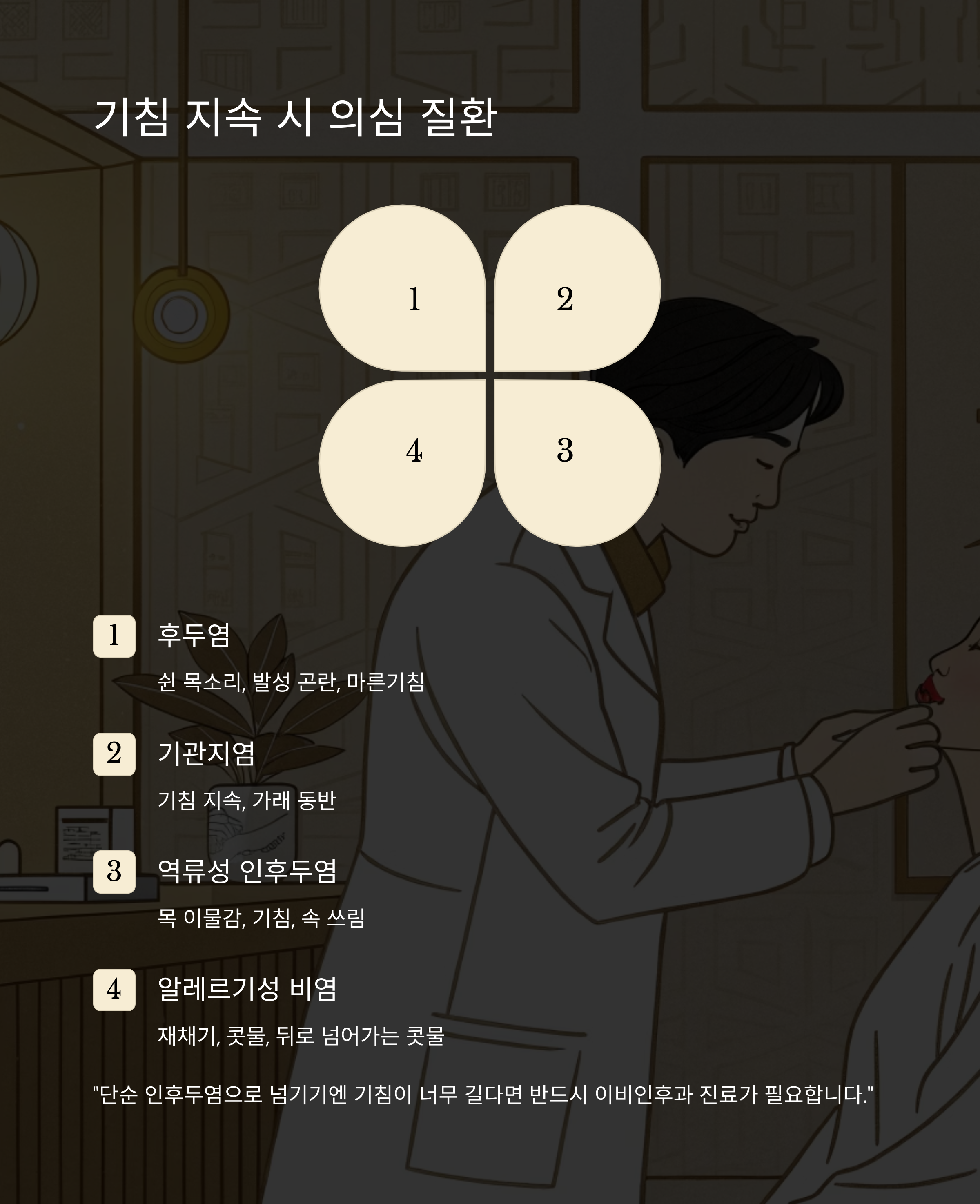 "단순 인후두염으로 넘기기엔 기침이 너무 길다면 반드시 이비인후과 진료가 필요합니다."