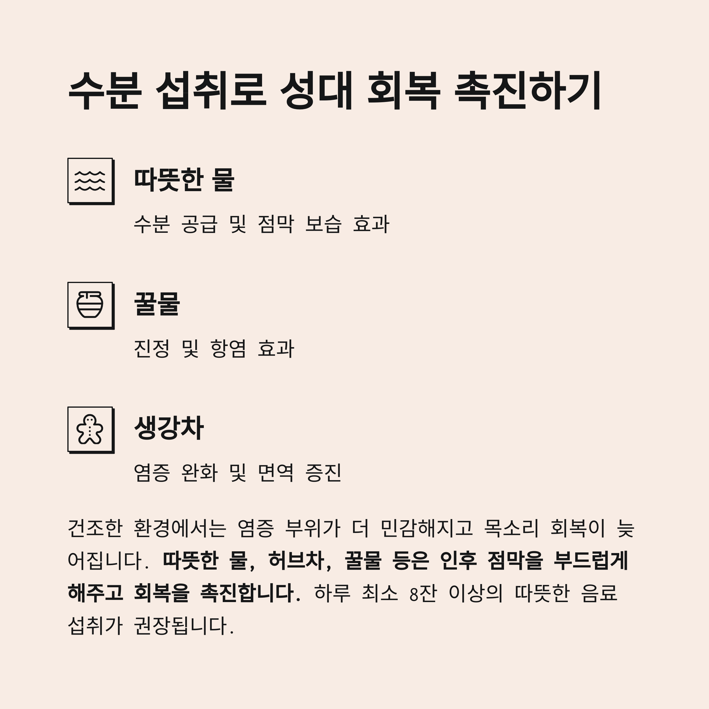 따뜻한 물, 허브차, 꿀물 등은 인후 점막을 부드럽게 해주고 회복을 촉진합니다.
