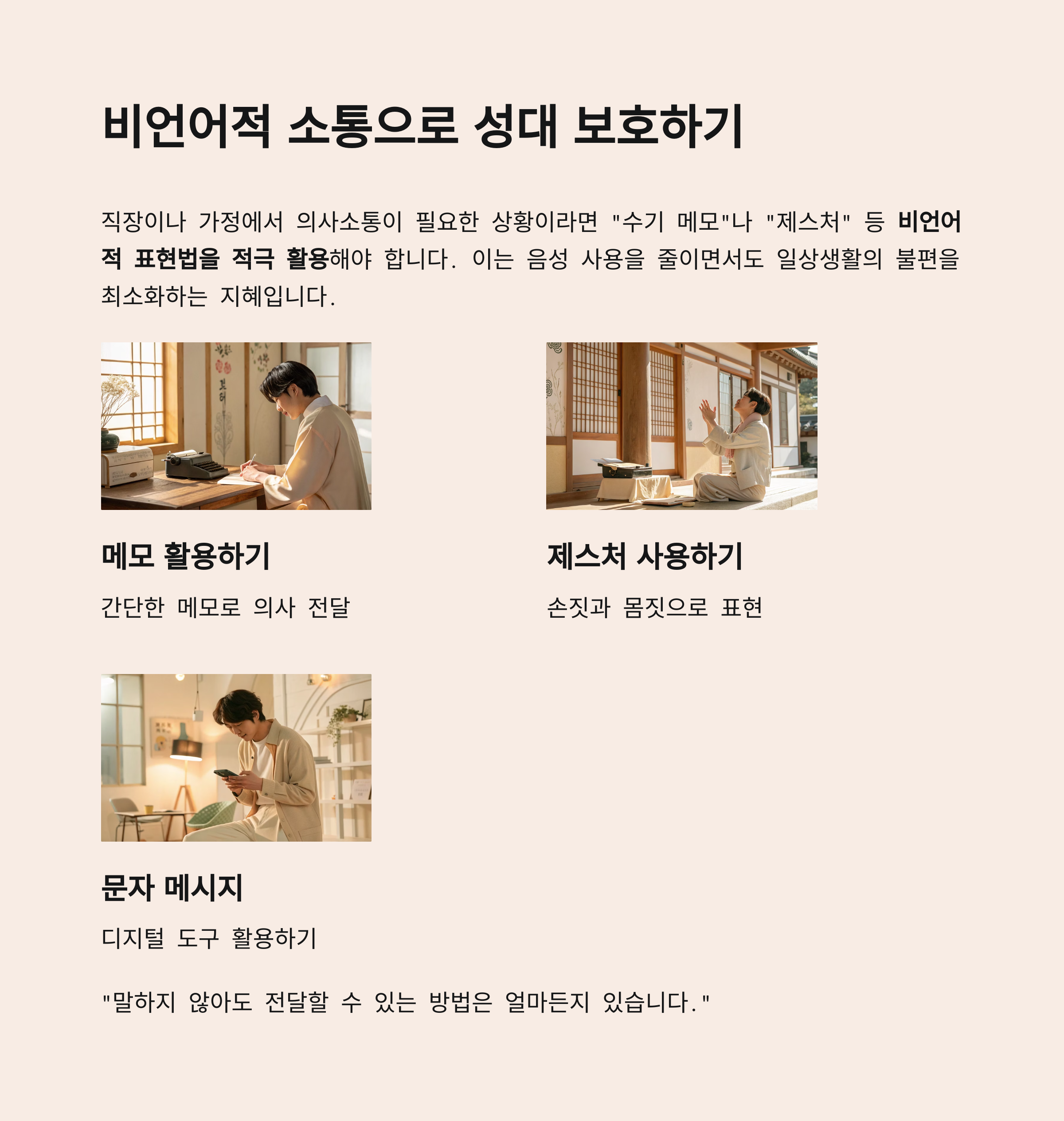 "수기 메모"나 "제스처" 등 비언어적 표현법을 적극 활용해야 합니다.