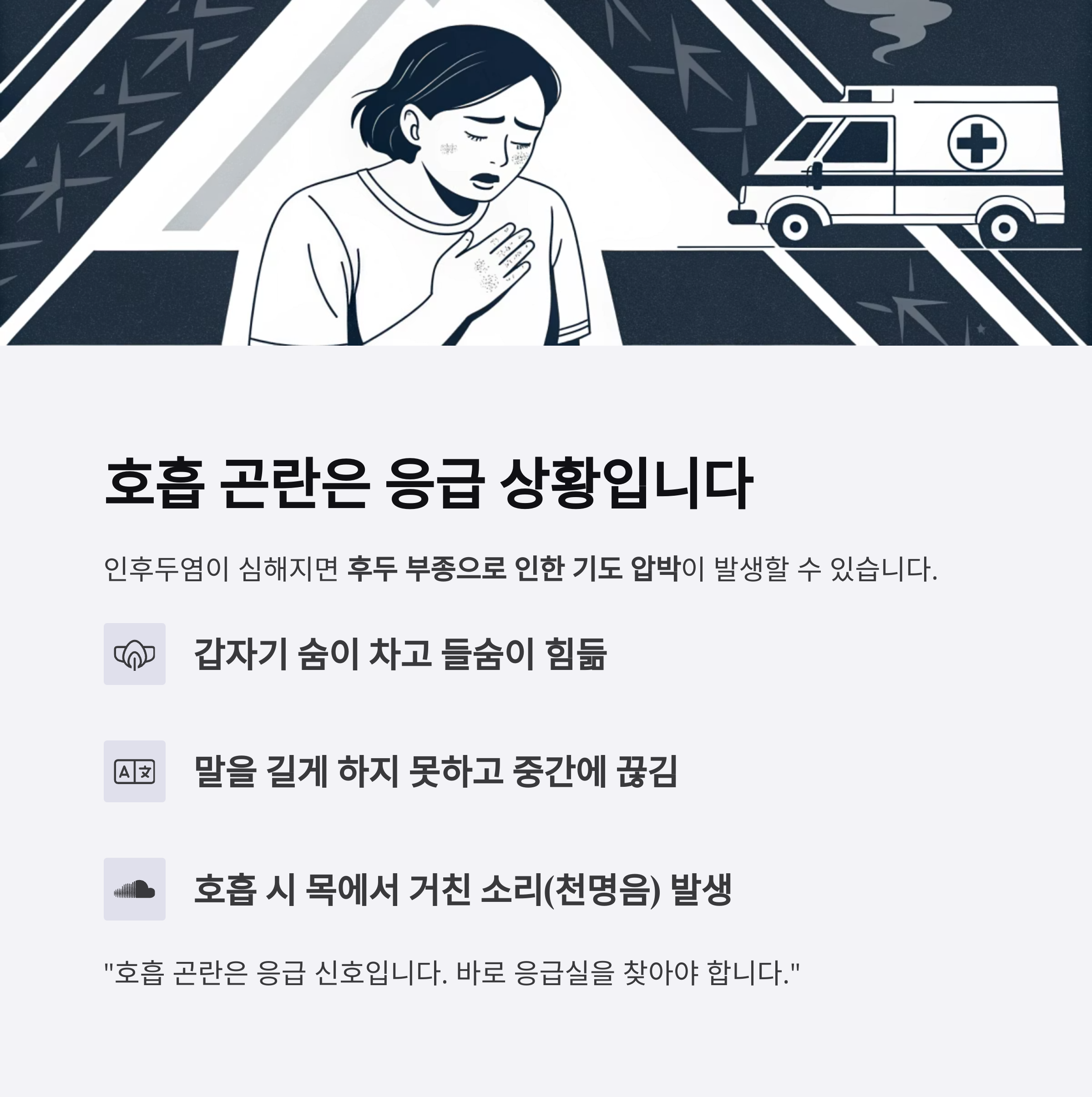 "호흡 곤란은 응급 신호입니다. 바로 응급실을 찾아야 합니다."