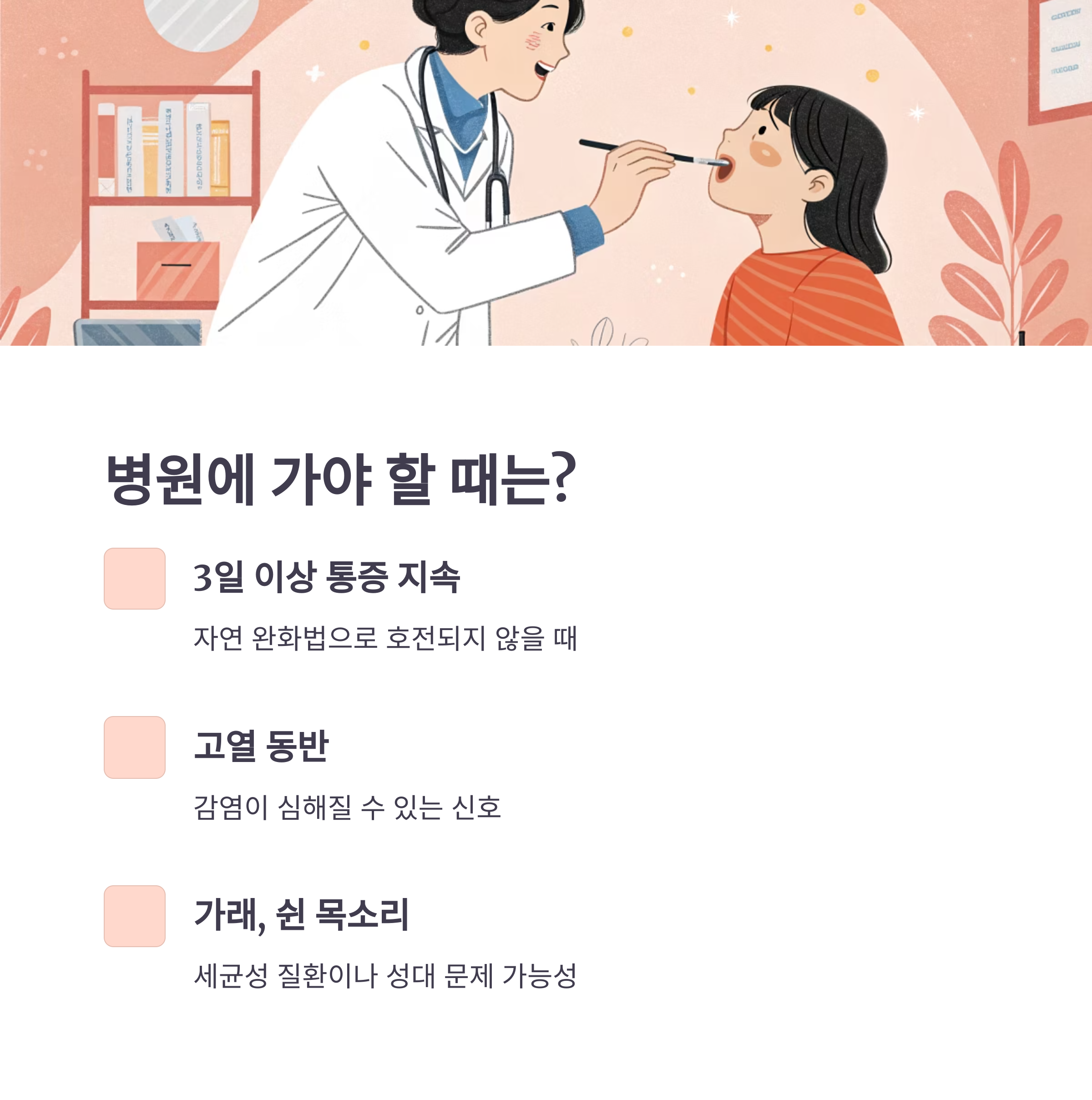 3일 이상 통증이 계속되거나, 열·가래·쉰 목소리가 동반되면 반드시 병원 진료를 받아야 합니다.
