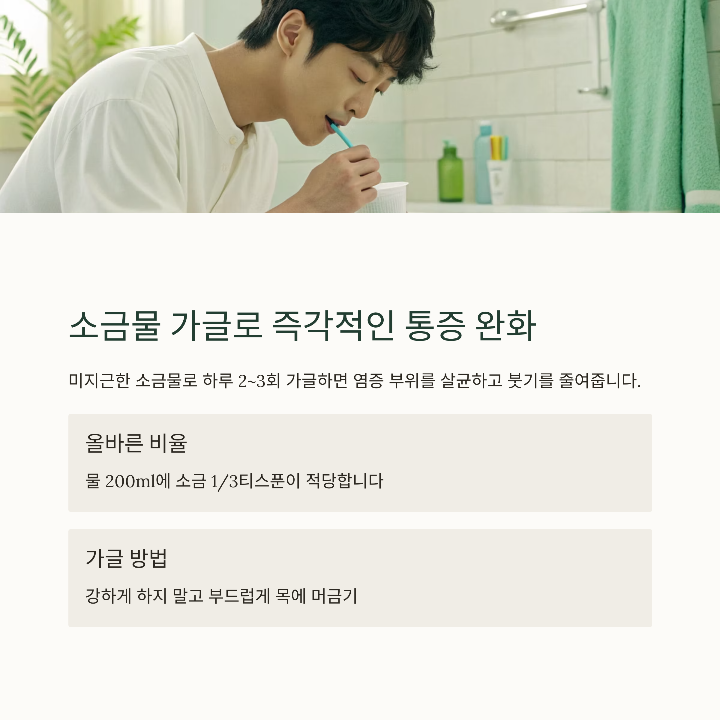 "너무 짜게 하면 오히려 자극이 될 수 있으므로, 물 200ml에 소금 1/3티스푼 비율이 적당합니다."