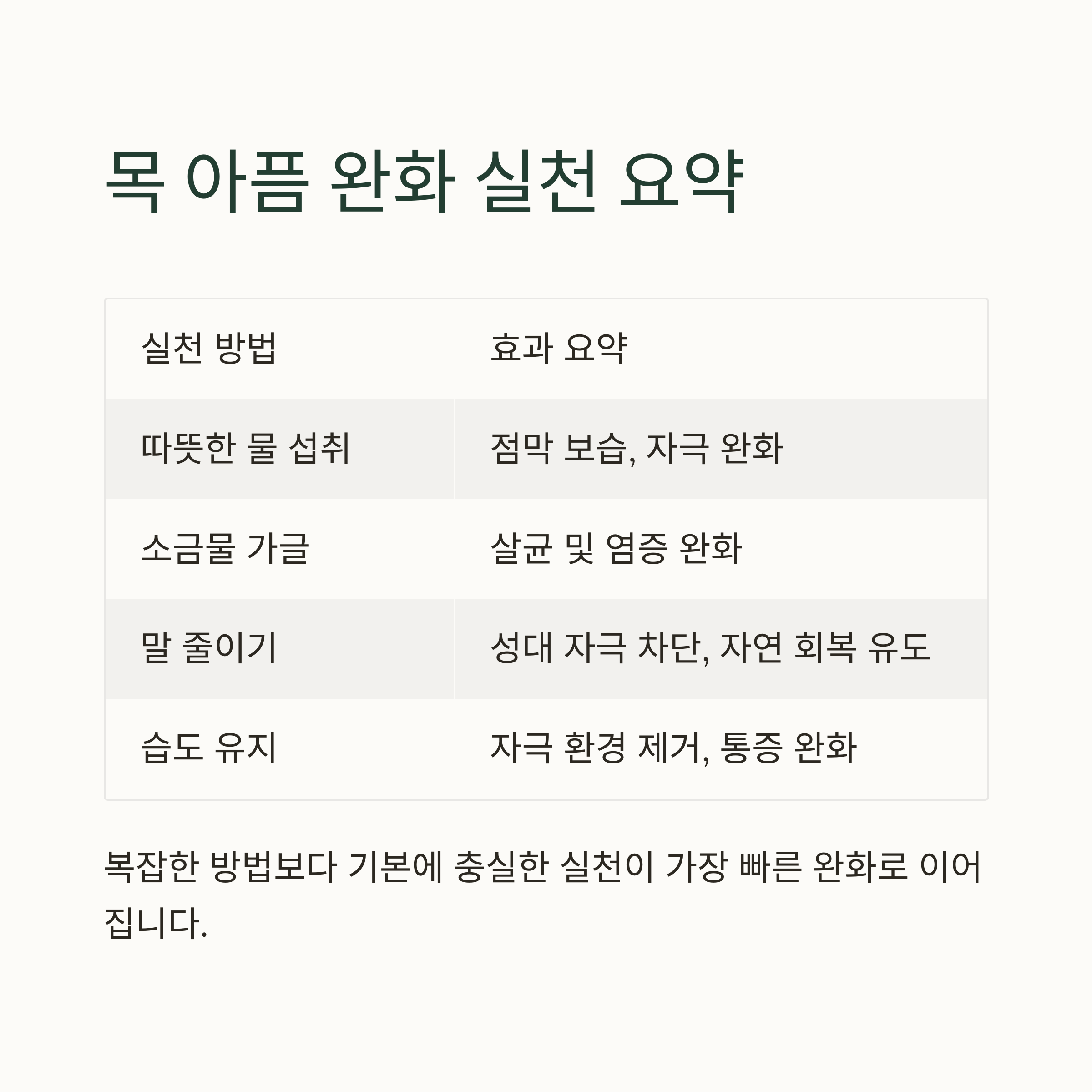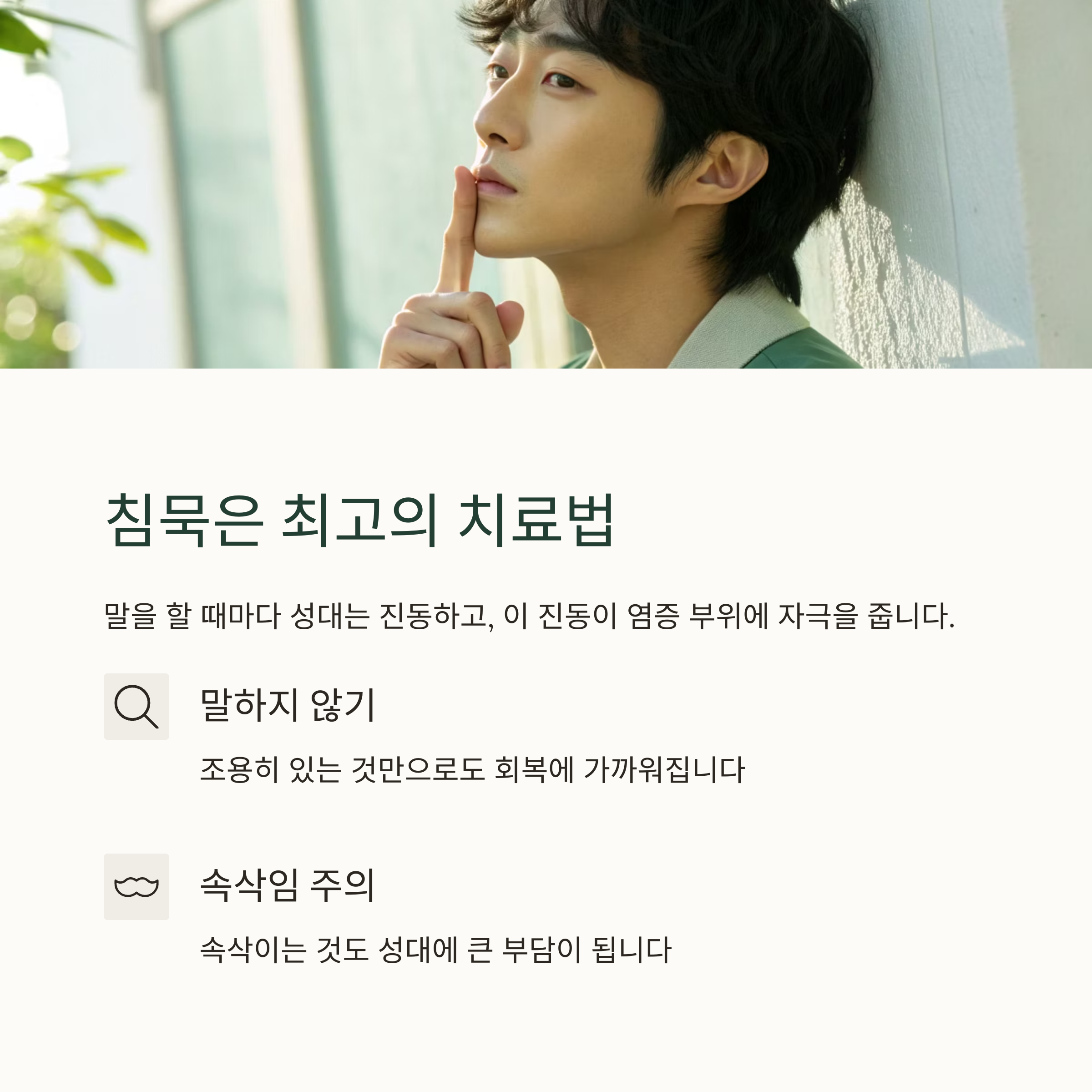 | 말 줄이기 | 성대 자극 차단, 자연 회복 유도 |