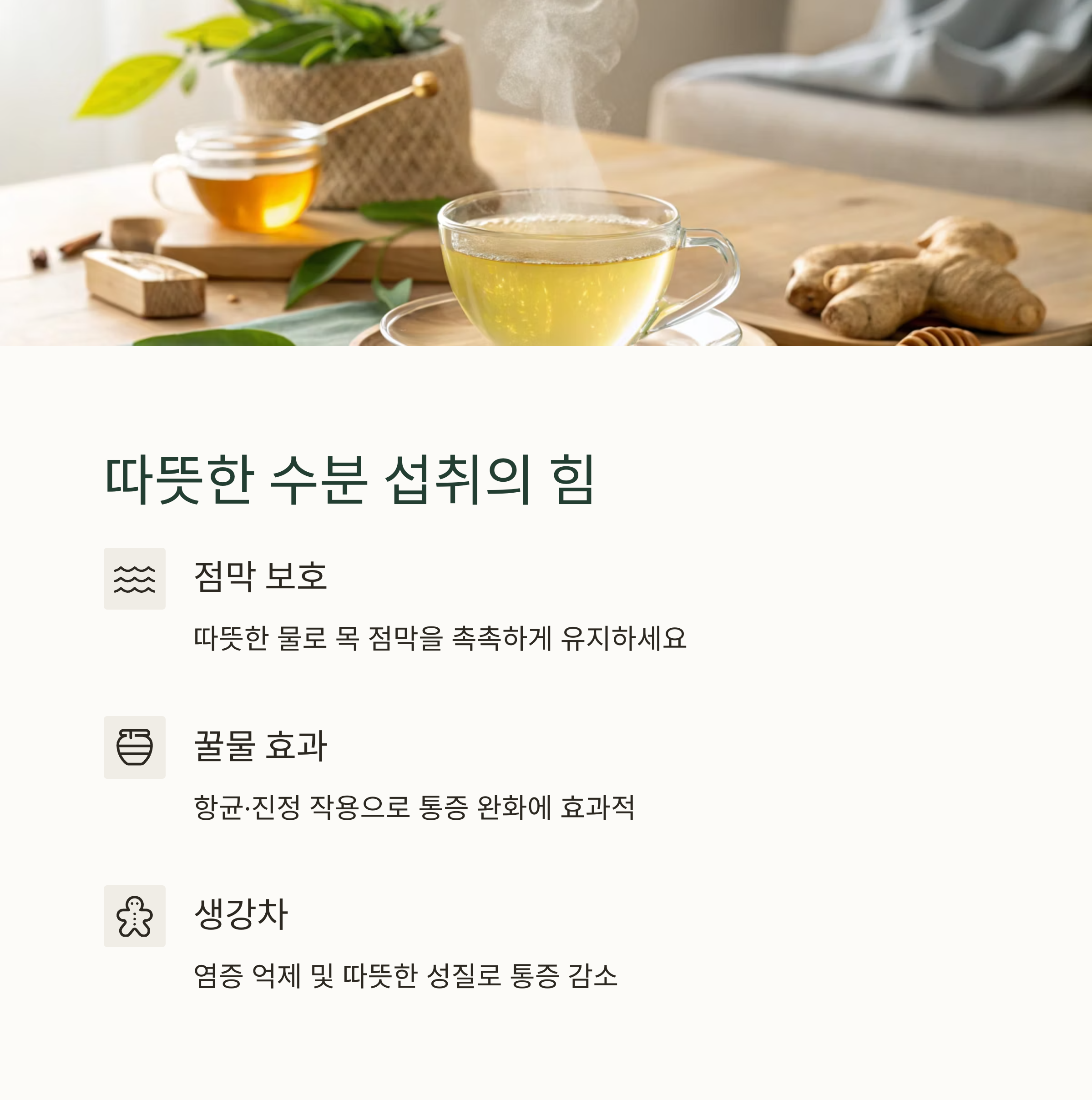 | 따뜻한 물 | 수분 공급, 점막 보호 |