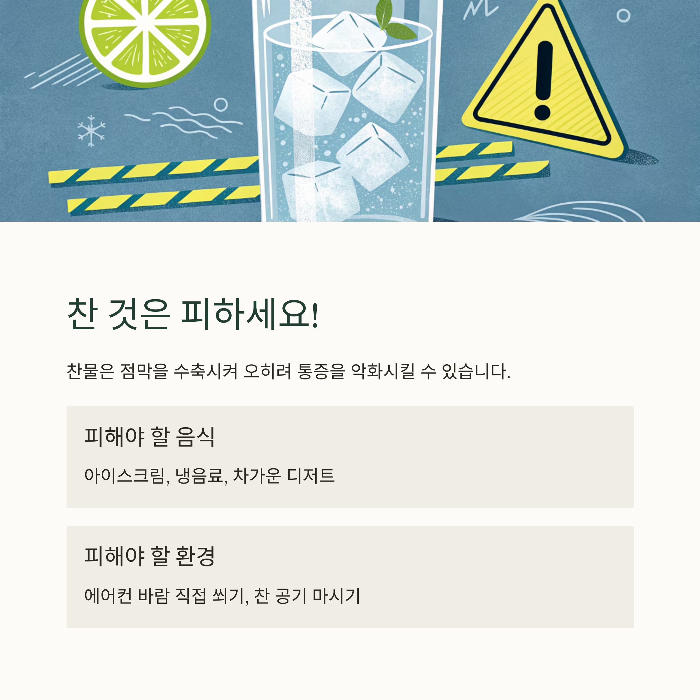 "찬물은 점막을 수축시켜 오히려 통증을 악화시킬 수 있으므로 피해야 합니다."