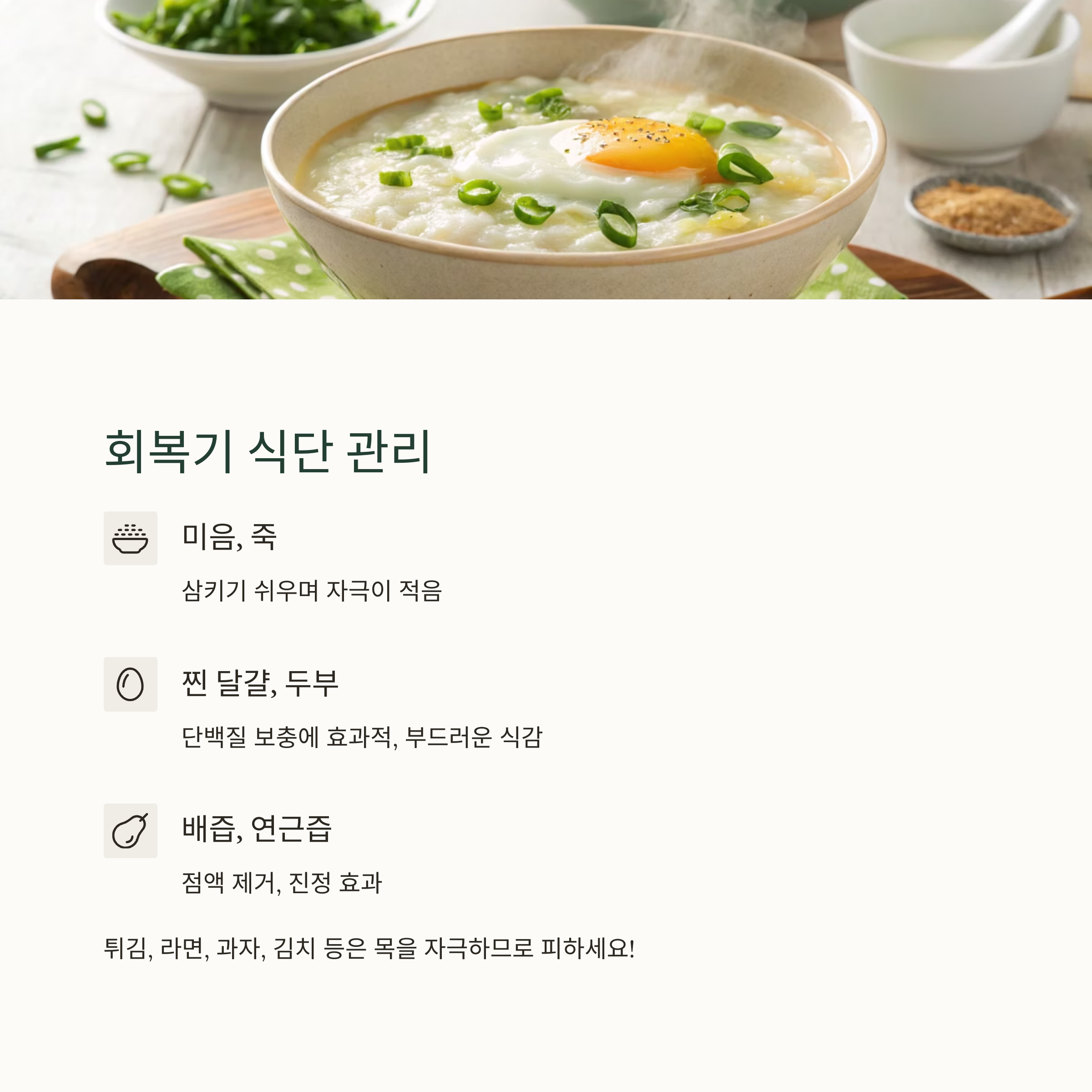 | 미음, 죽 | 삼키기 쉬우며 자극이 적음 |