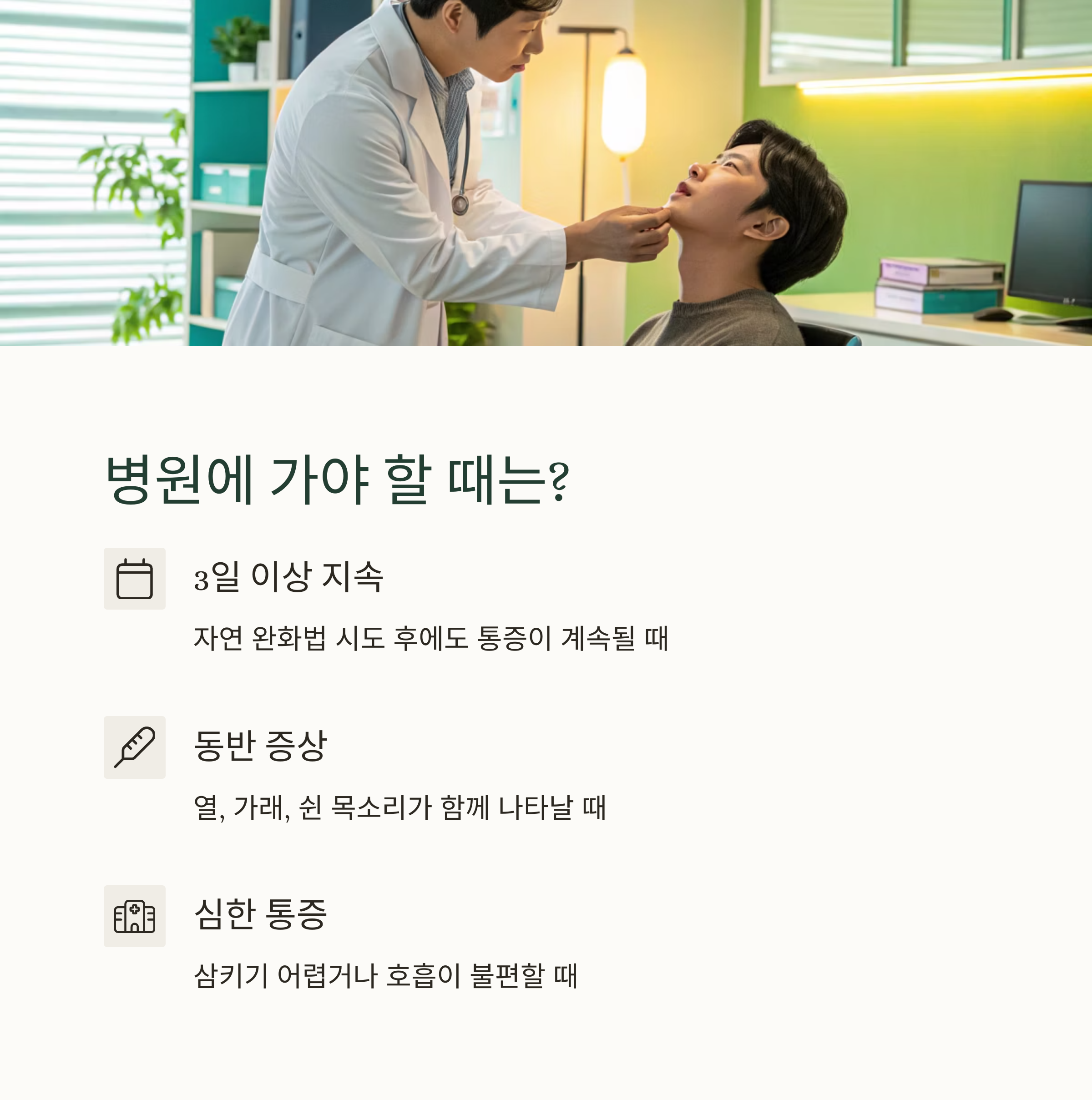 3일 이상 통증이 계속되거나, 열·가래·쉰 목소리가 동반되면 반드시 병원 진료를 받아야 합니다.