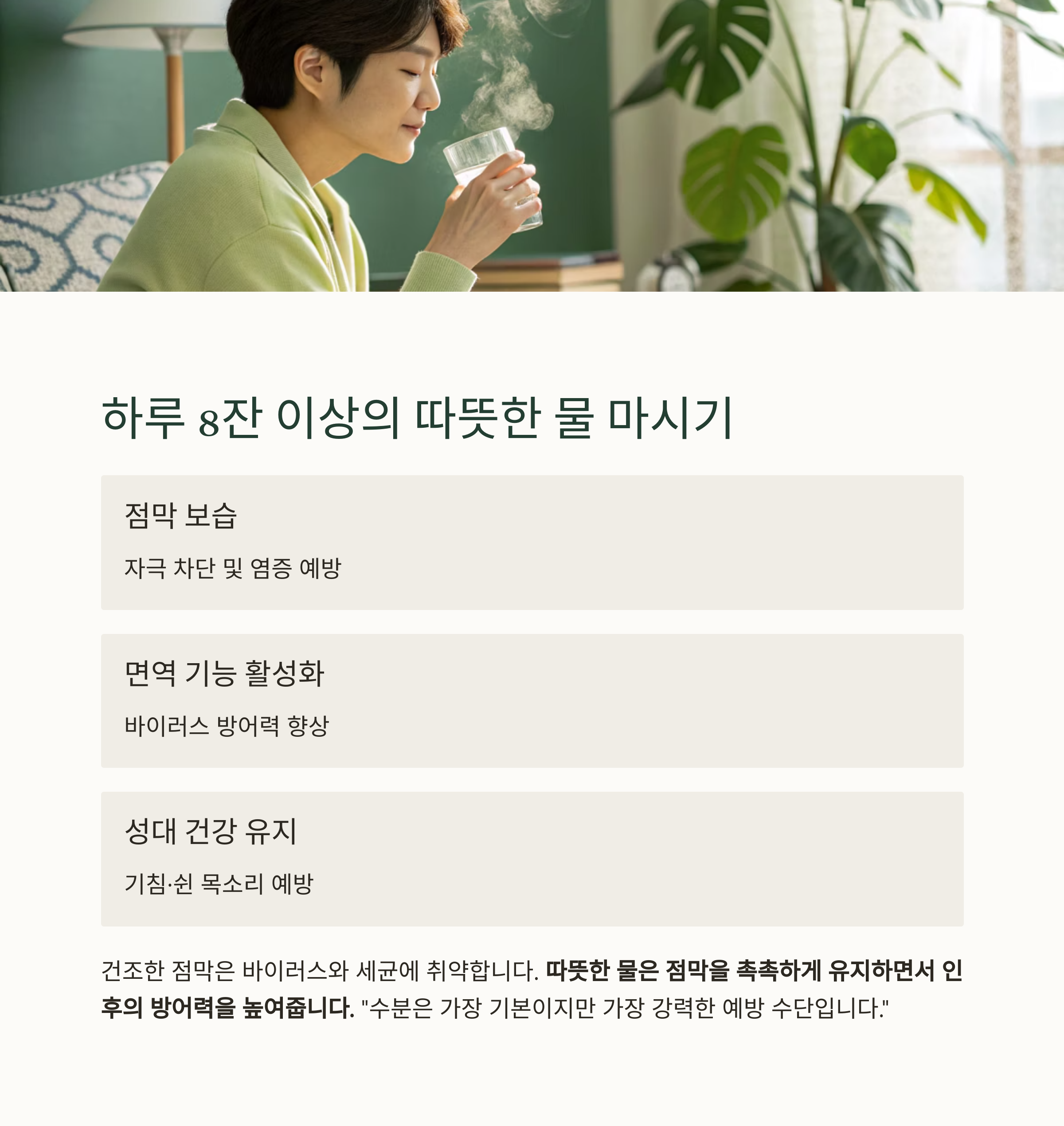 따뜻한 물은 점막을 촉촉하게 유지하면서 인후의 방어력을 높여줍니다.