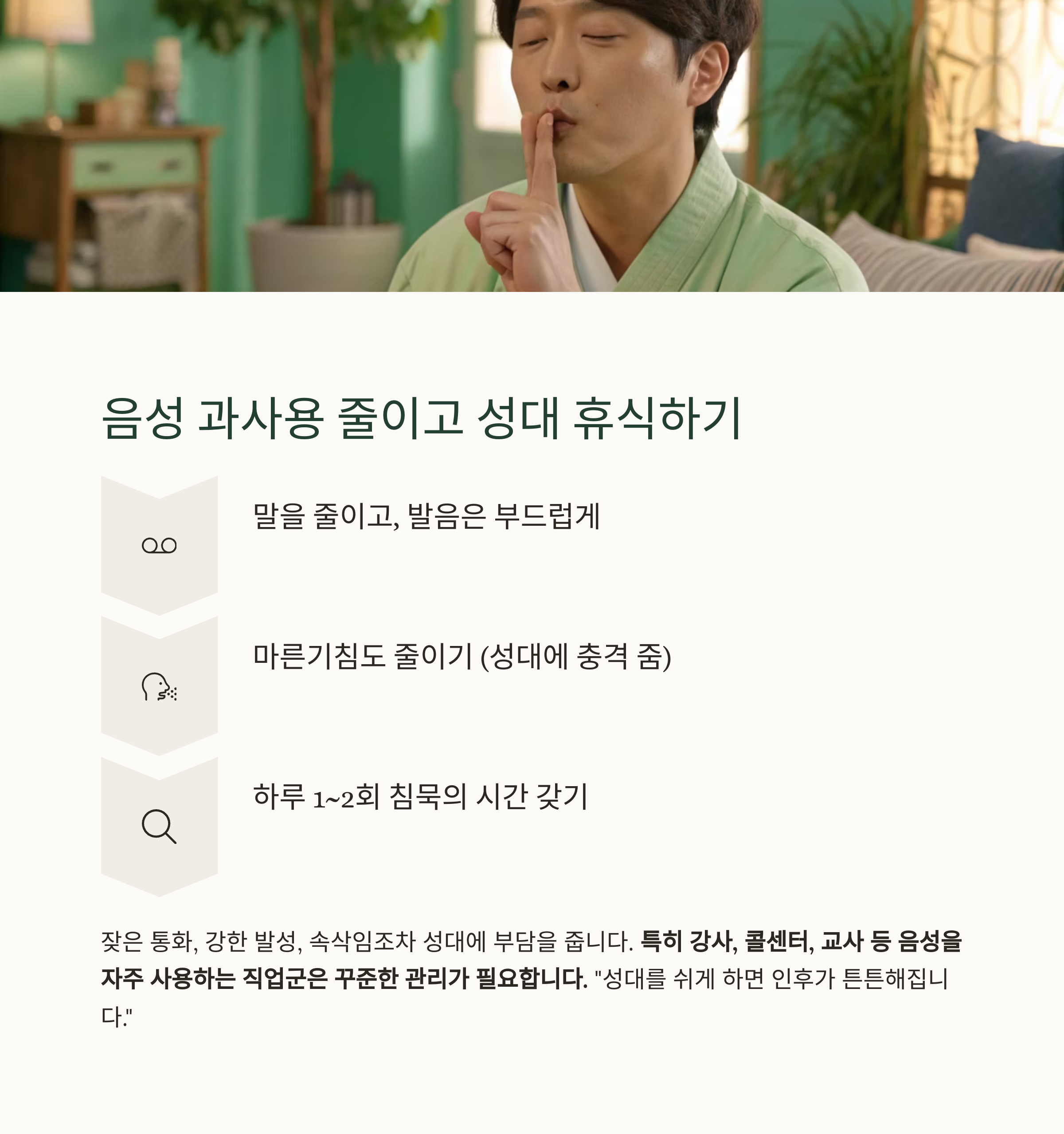 특히 강사, 콜센터, 교사 등 음성을 자주 사용하는 직업군은 꾸준한 관리가 필요합니다.