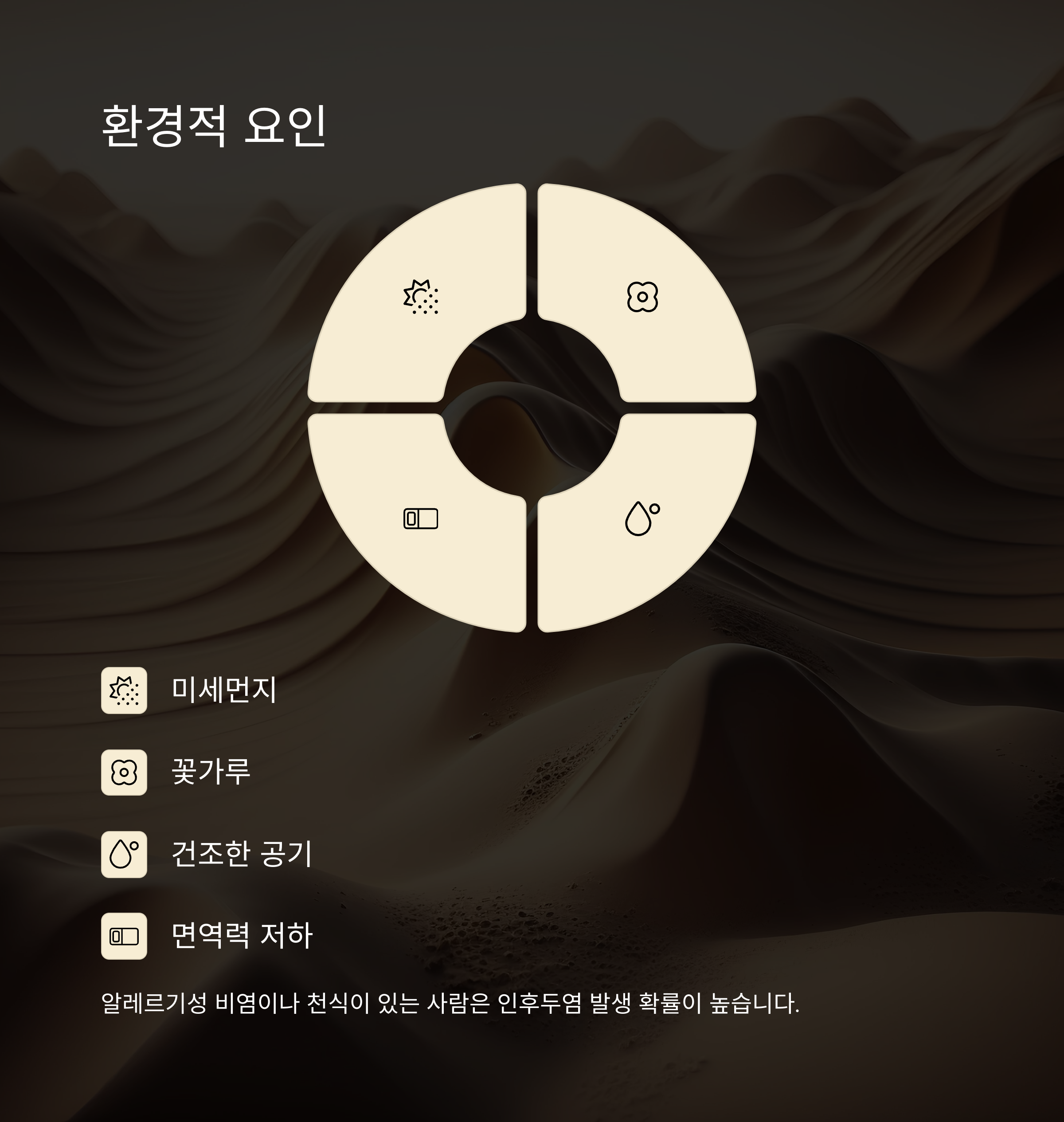 꽃가루, 진드기, 미세먼지, 건조한 실내 공기 등도 인후 점막에 자극을 줄 수 있습니다.