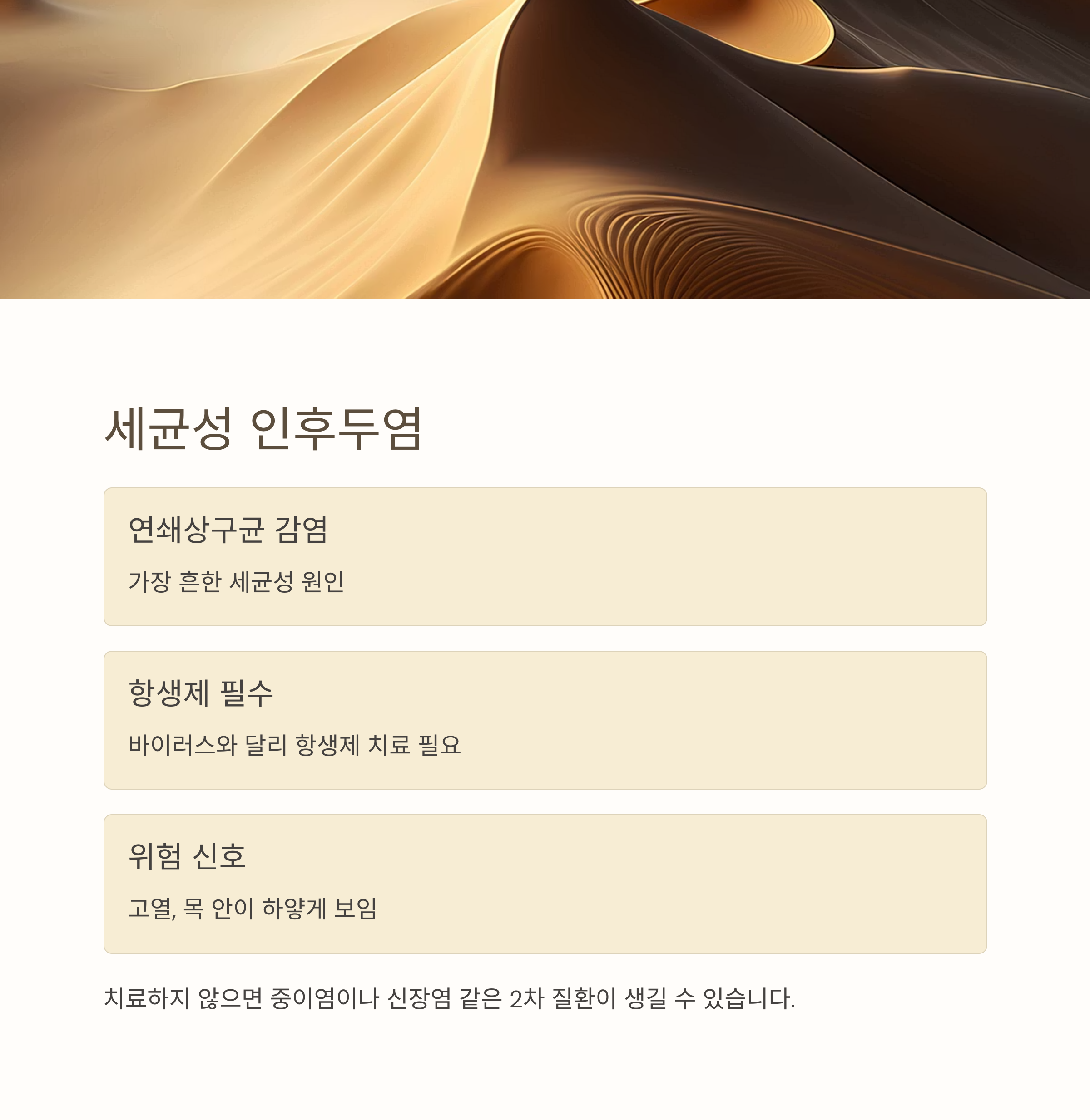 세균에 의한 인후두염은 연쇄상구균(streptococcus) 감염이 대표적입니다.