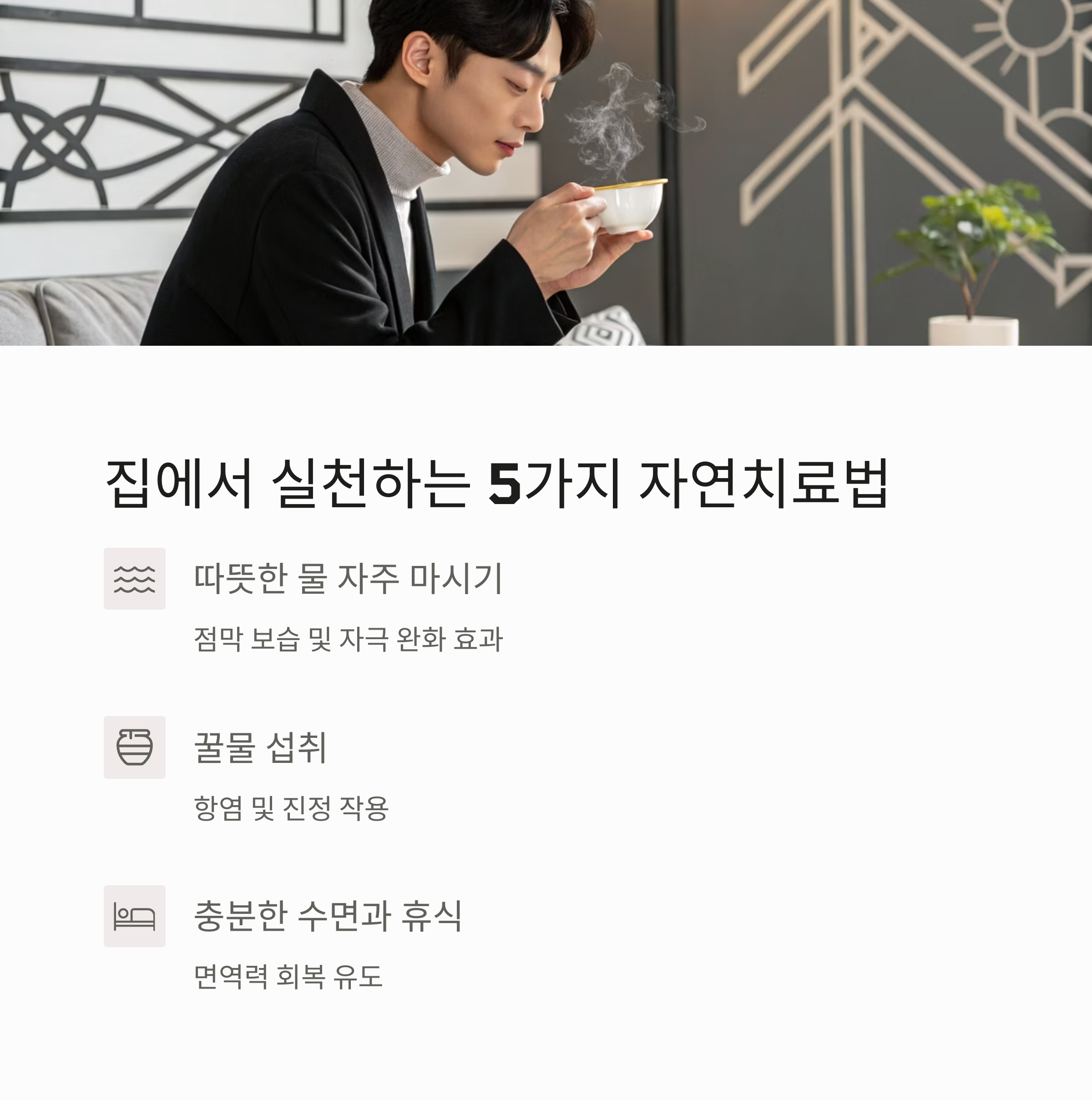 충분한 수분 섭취, 휴식, 금연, 따뜻한 식사 등의 자연적 방법을 병행하는 것입니다.