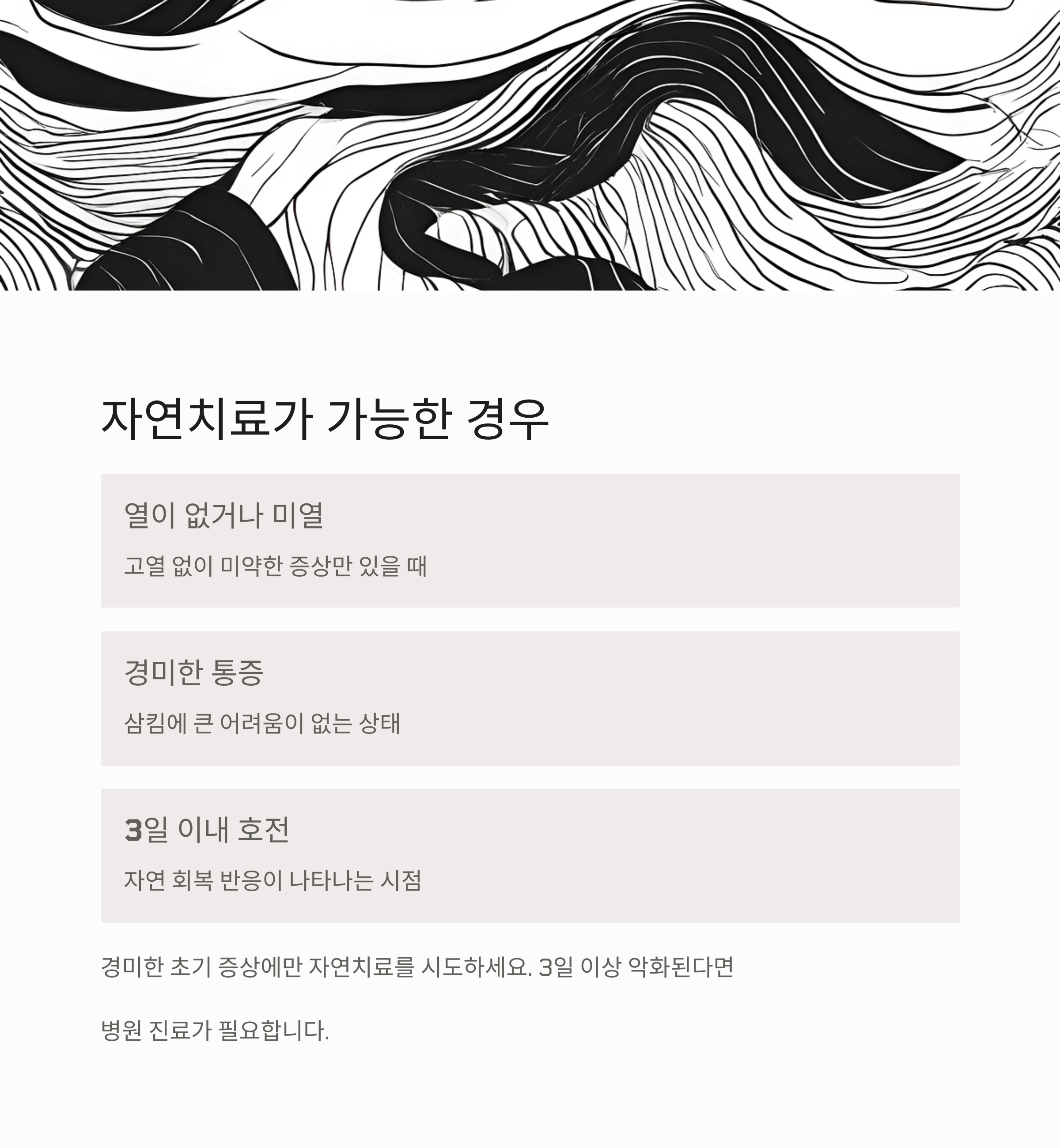 "자연치료는 경미한 초기 증상에만 한정되며, 3일 이상 악화된다면 병원 진료가 필요합니다."