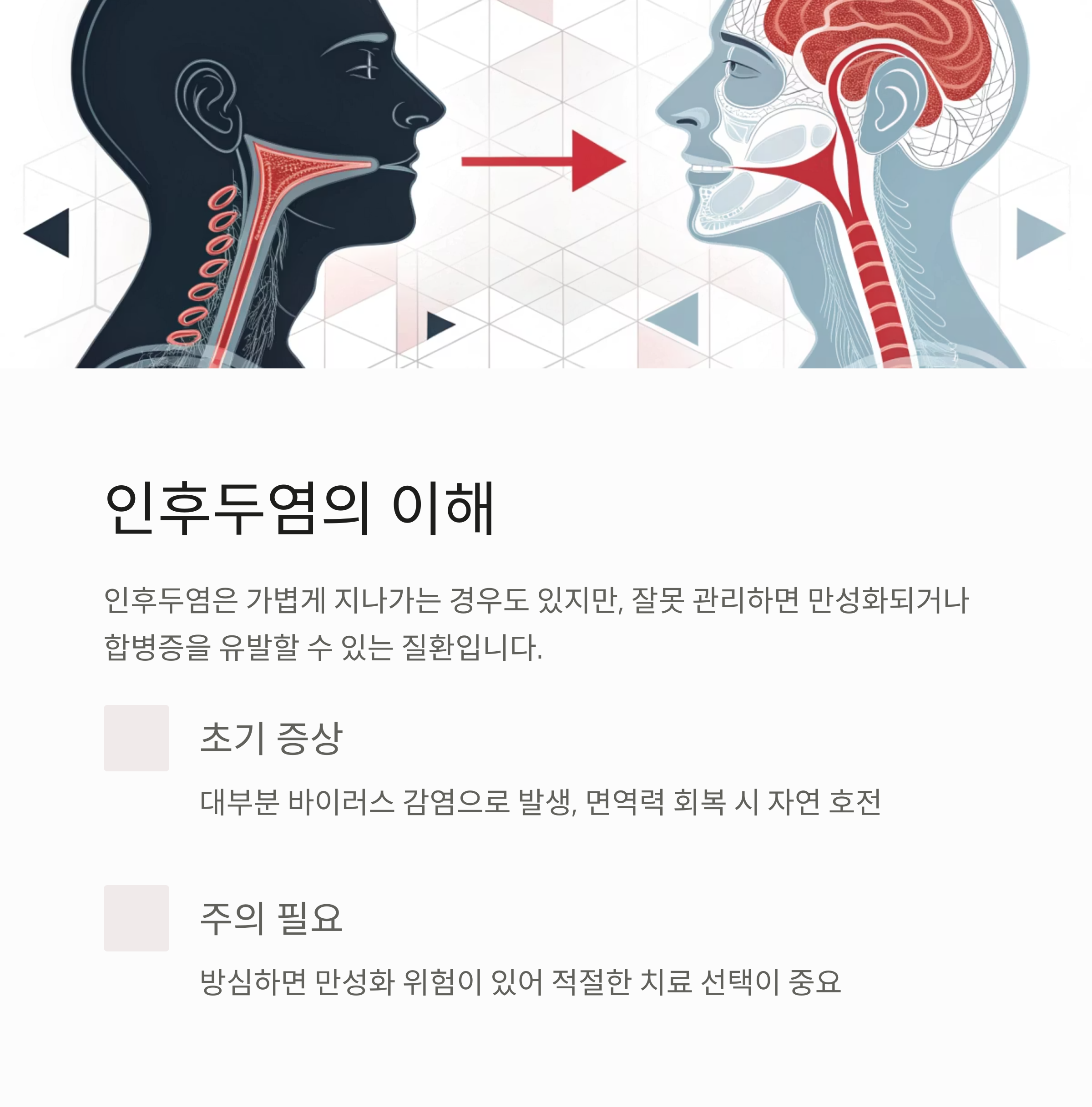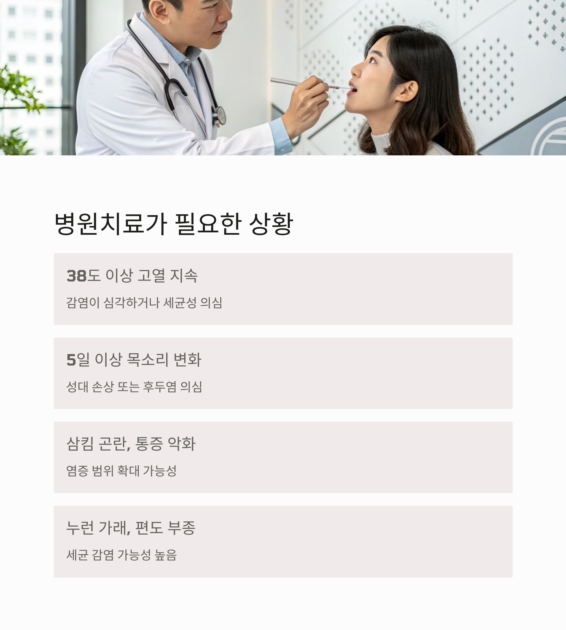 | 증상 경도 | 미약한 인후통, 미열 | 고열, 통증 심화, 쉰 목소리 지속 |