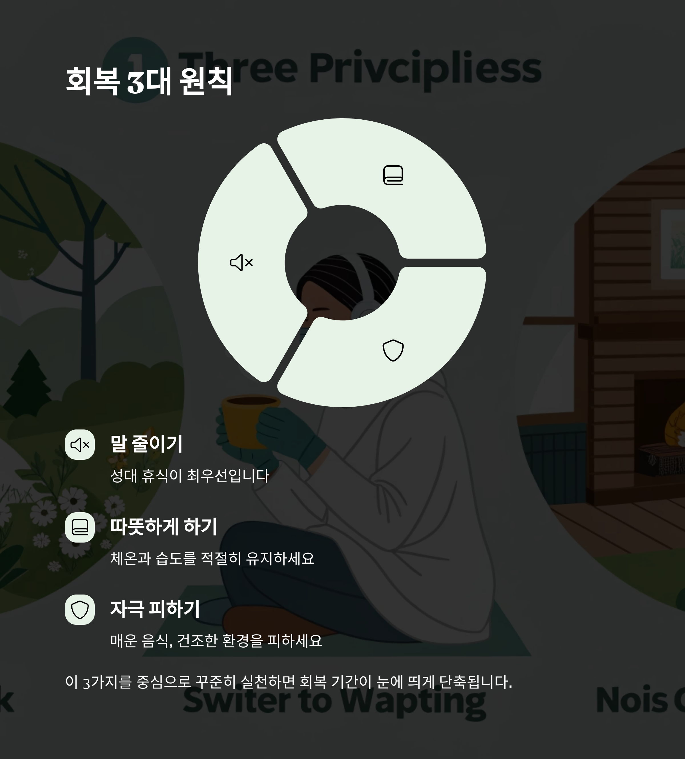 이 3가지를 중심으로 꾸준히 실천한다면 회복 기간은 눈에 띄게 단축될 수 있습니다.