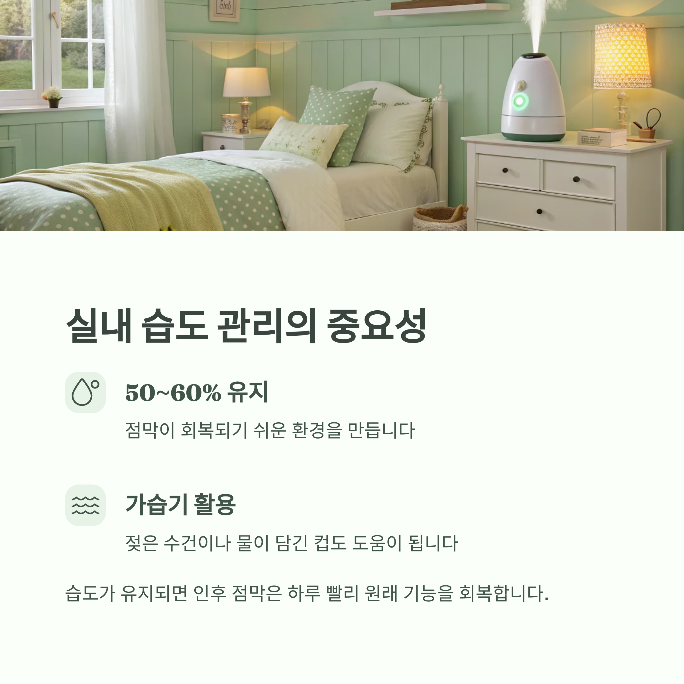 실내 습도를 50~60% 수준으로 유지해야 점막이 회복되기 쉬운 환경이 됩니다.