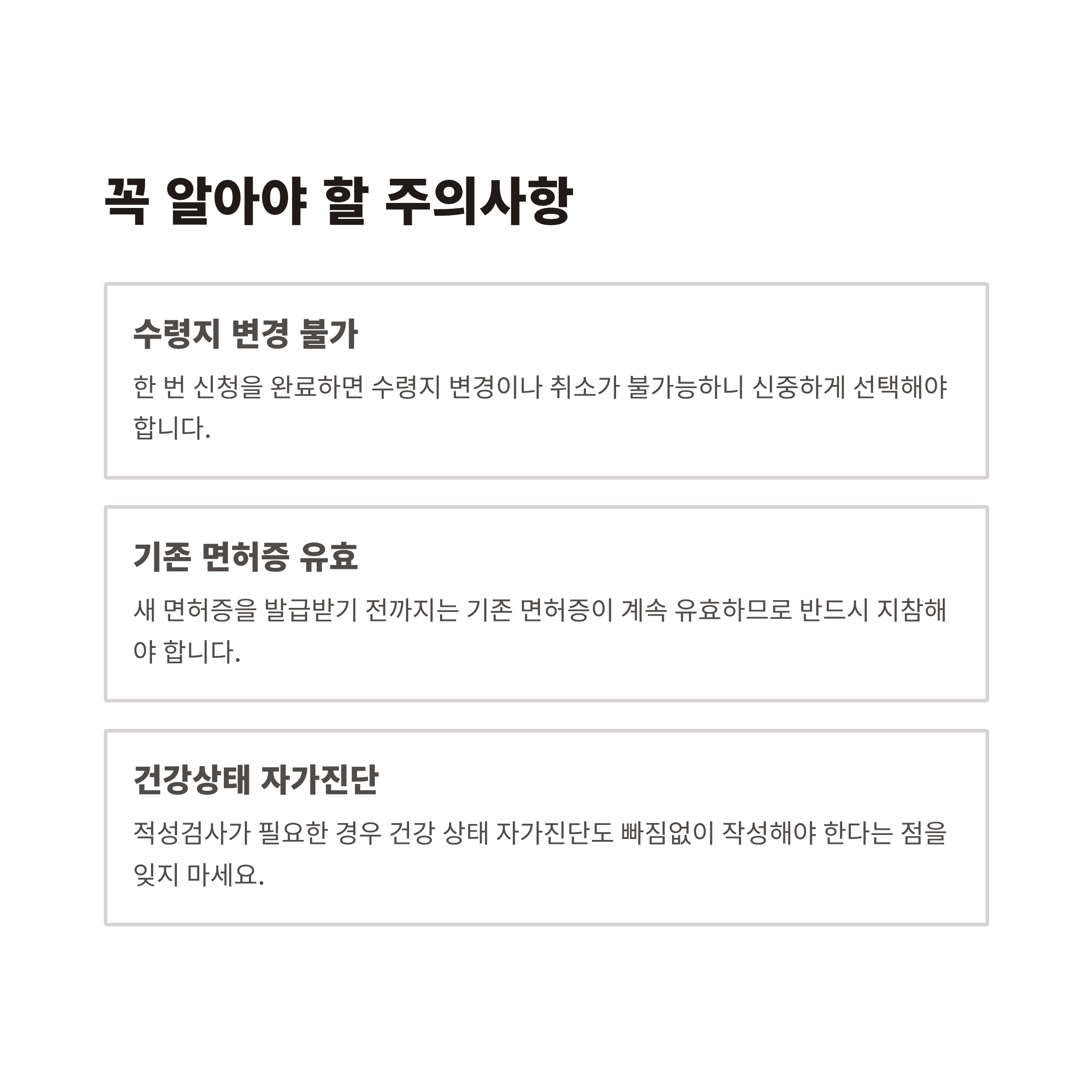 한 번 신청을 완료하면 수령지 변경이나 취소가 불가능하니 신중하게 선택해야 합니다. 또, 새 면허증을 발급받기 전까지는 기존 면허증이 계속 유효하므로 반드시 지참해야 합니다. 적성검사가 필요한 경우 건강 상태 자가진단도 빠짐없이 작성해야 한다는 점을 잊지 마세요.