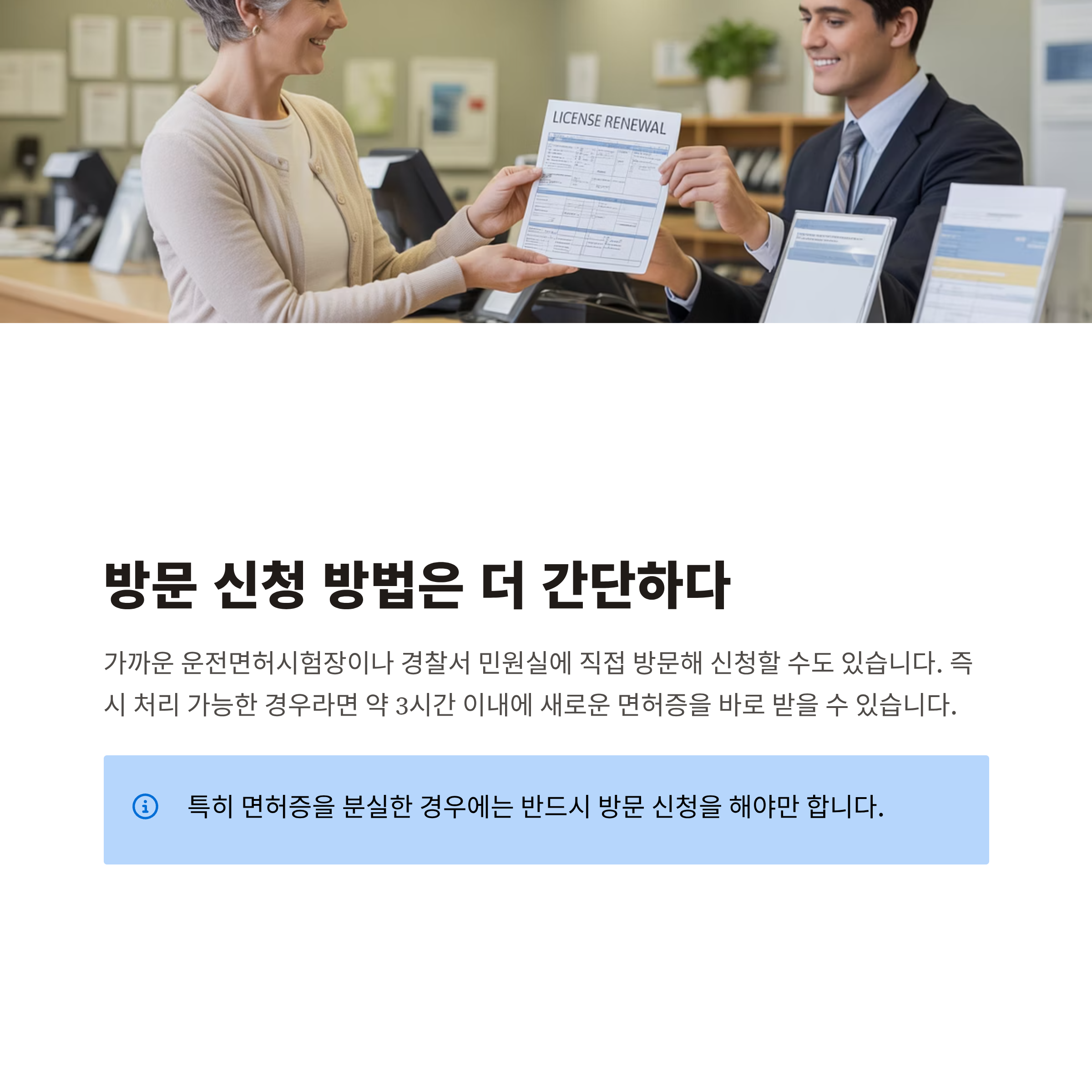 가까운 운전면허시험장이나 경찰서 민원실에 직접 방문해 신청할 수도 있습니다. 즉시 처리 가능한 경우라면 약 3시간 이내에 새로운 면허증을 바로 받을 수 있습니다. 특히 면허증을 분실한 경우에는 반드시 방문 신청을 해야만 합니다.