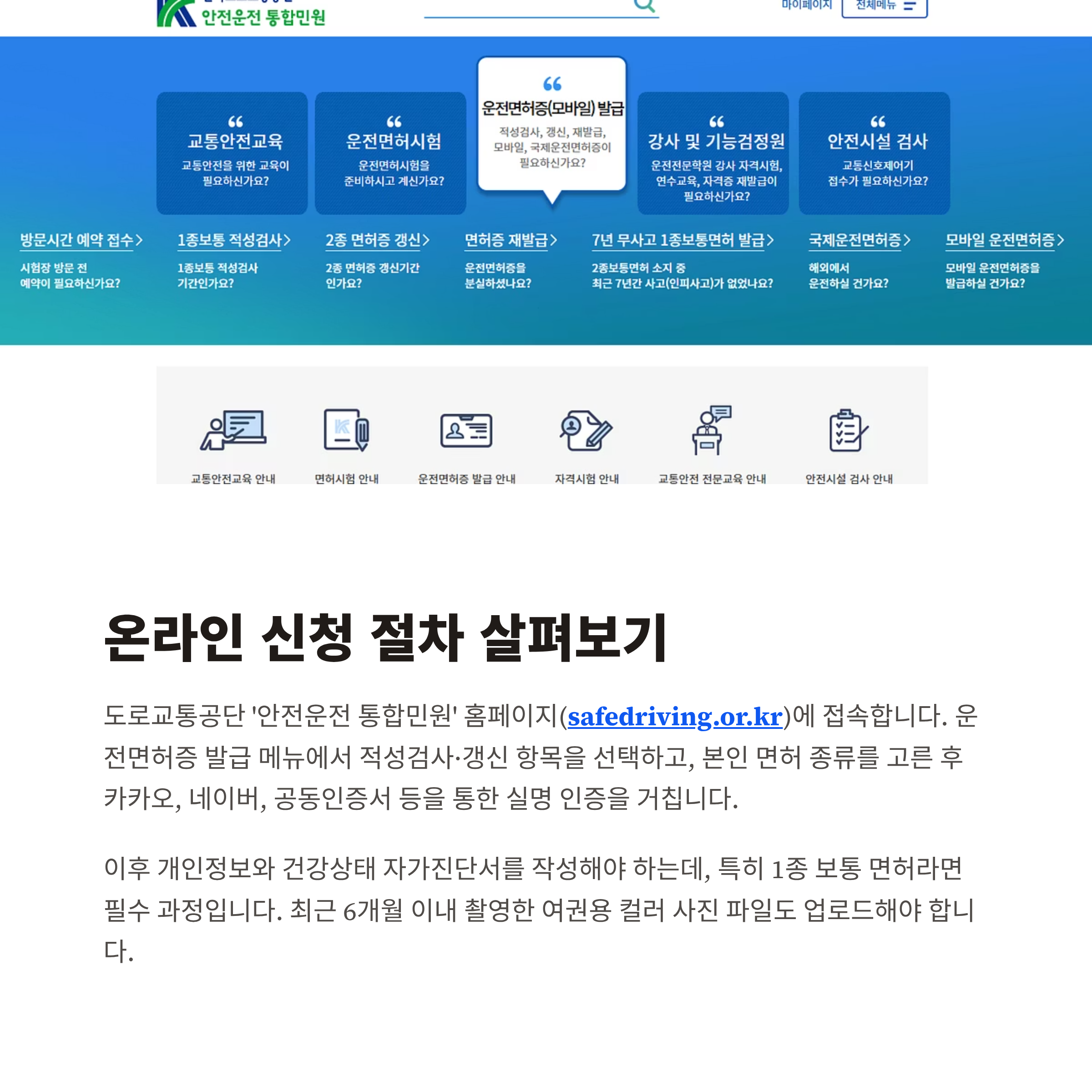 도로교통공단 ‘안전운전 통합민원’ 홈페이지(safedriving.or.kr)에 접속합니다. 운전면허증 발급 메뉴에서 적성검사·갱신 항목을 선택하고, 본인 면허 종류를 고른 후 카카오, 네이버, 공동인증서 등을 통한 실명 인증을 거칩니다.