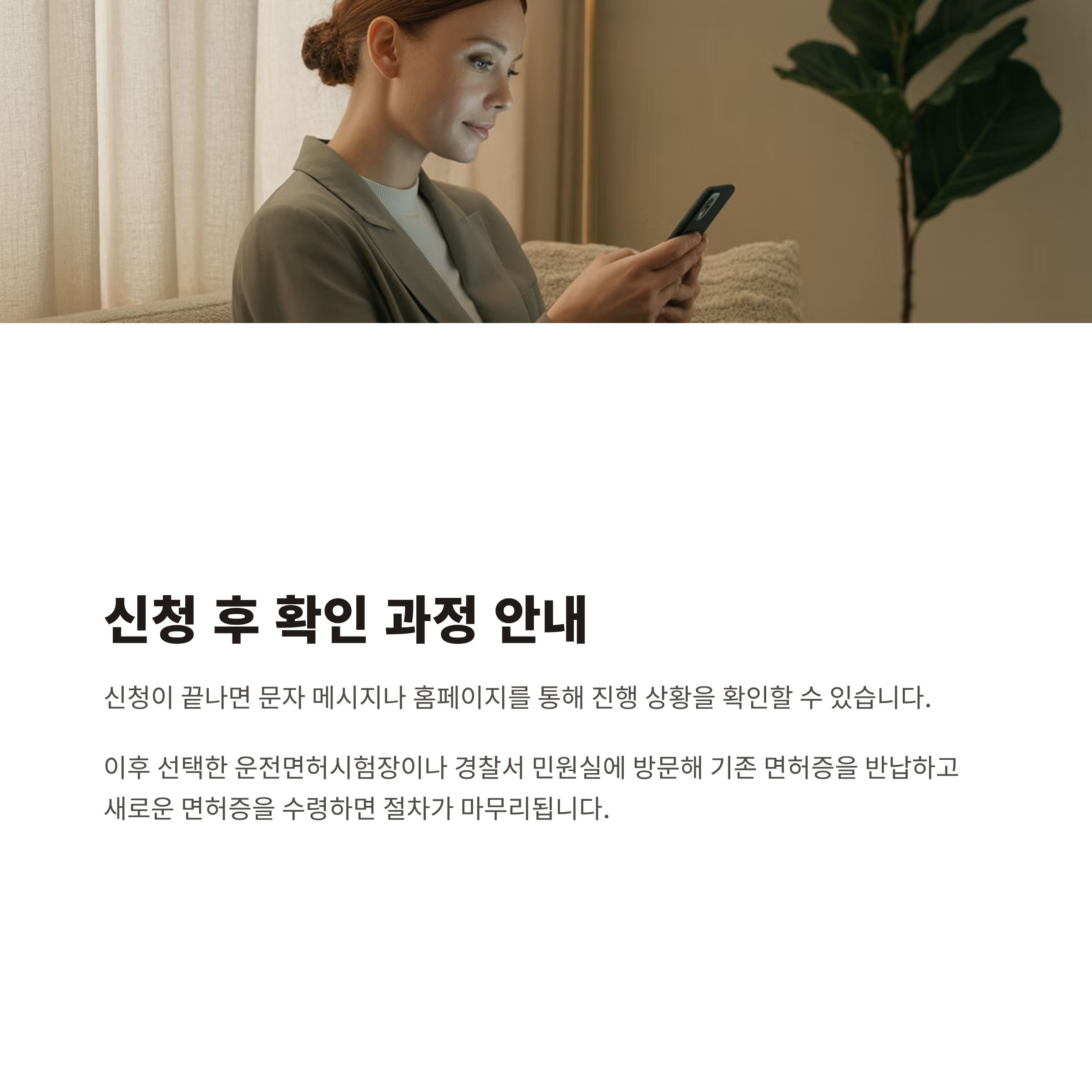 신청이 끝나면 문자 메시지나 홈페이지를 통해 진행 상황을 확인할 수 있습니다. 이후 선택한 운전면허시험장이나 경찰서 민원실에 방문해 기존 면허증을 반납하고 새로운 면허증을 수령하면 절차가 마무리됩니다.