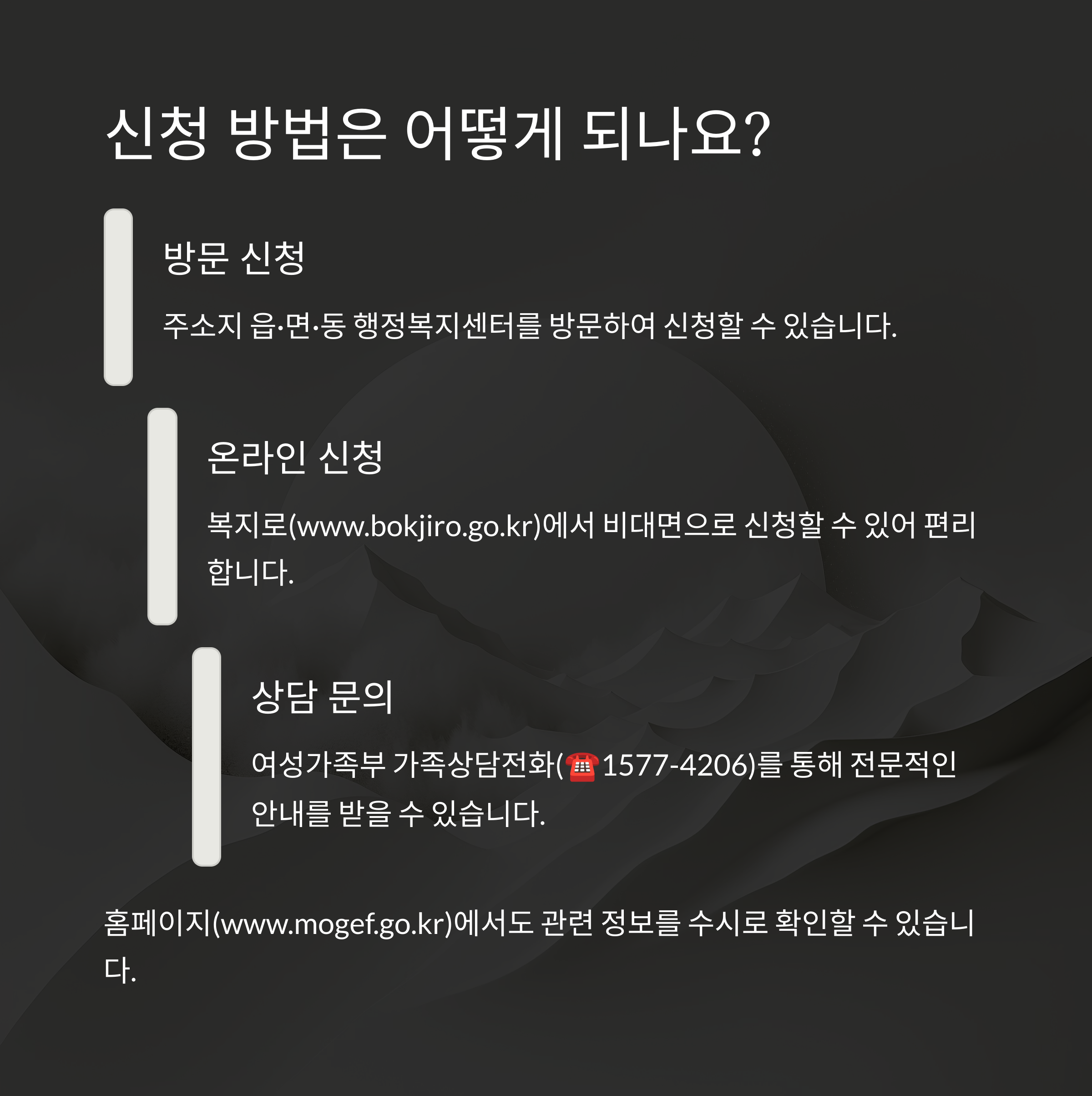 | 25~34세 청년 한부모 | 5세 이하 자녀 월 10만원 / 6~18세 자녀 월 5만원 |