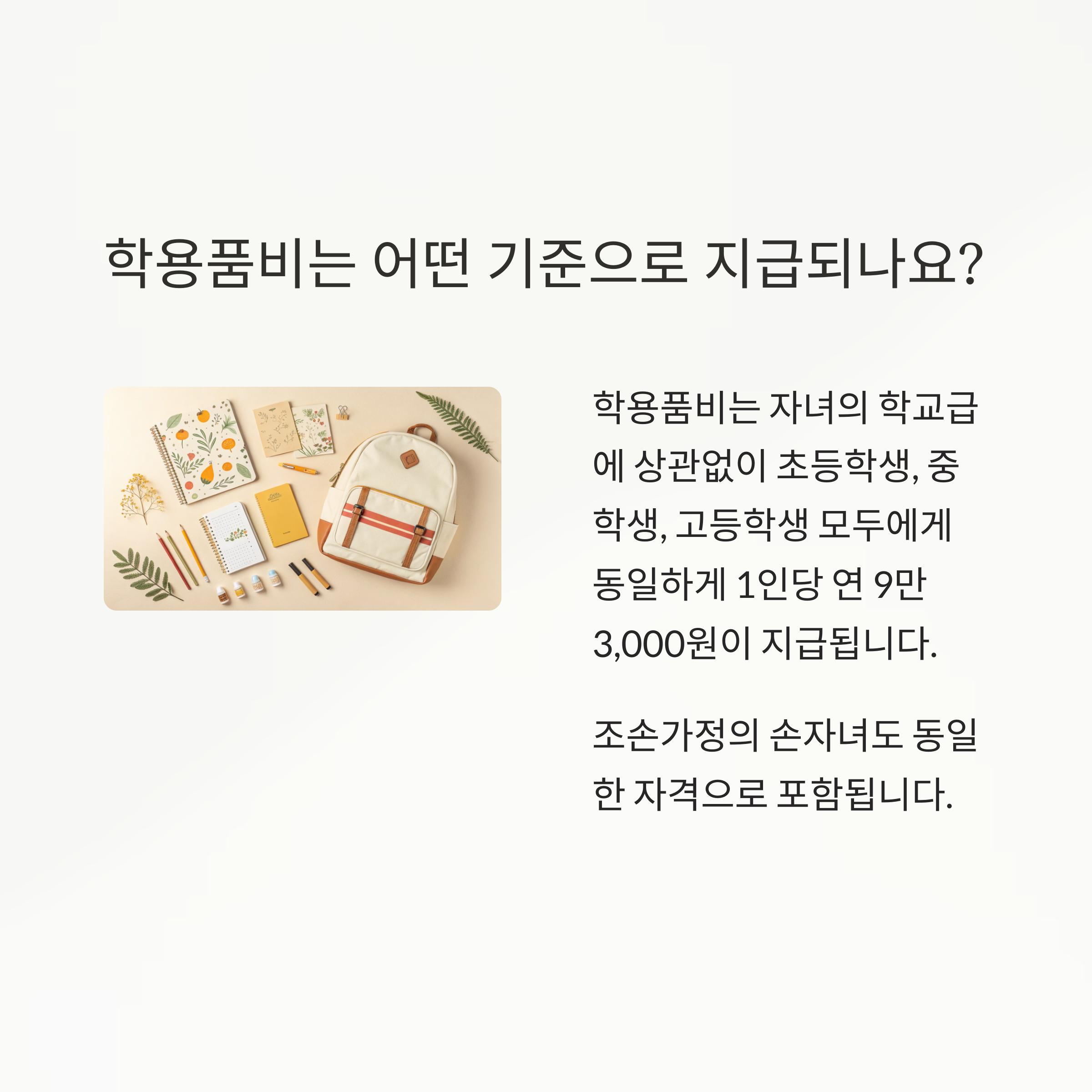 | 학용품비 | 초·중·고 자녀 1인당 연 9만 3,000원 지급 |
