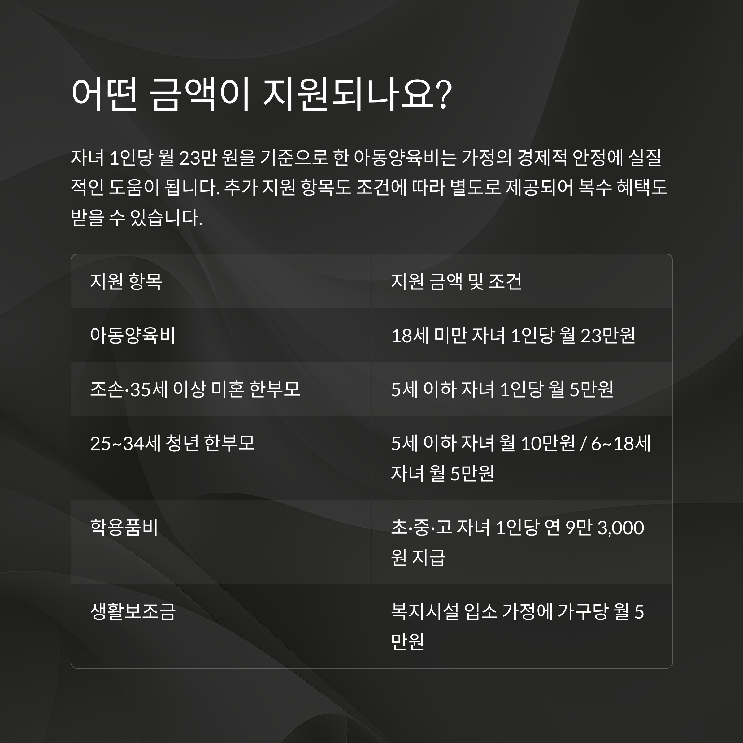 | 아동양육비 | 18세 미만 자녀, 고3은 졸업연도 12월까지 지원 |