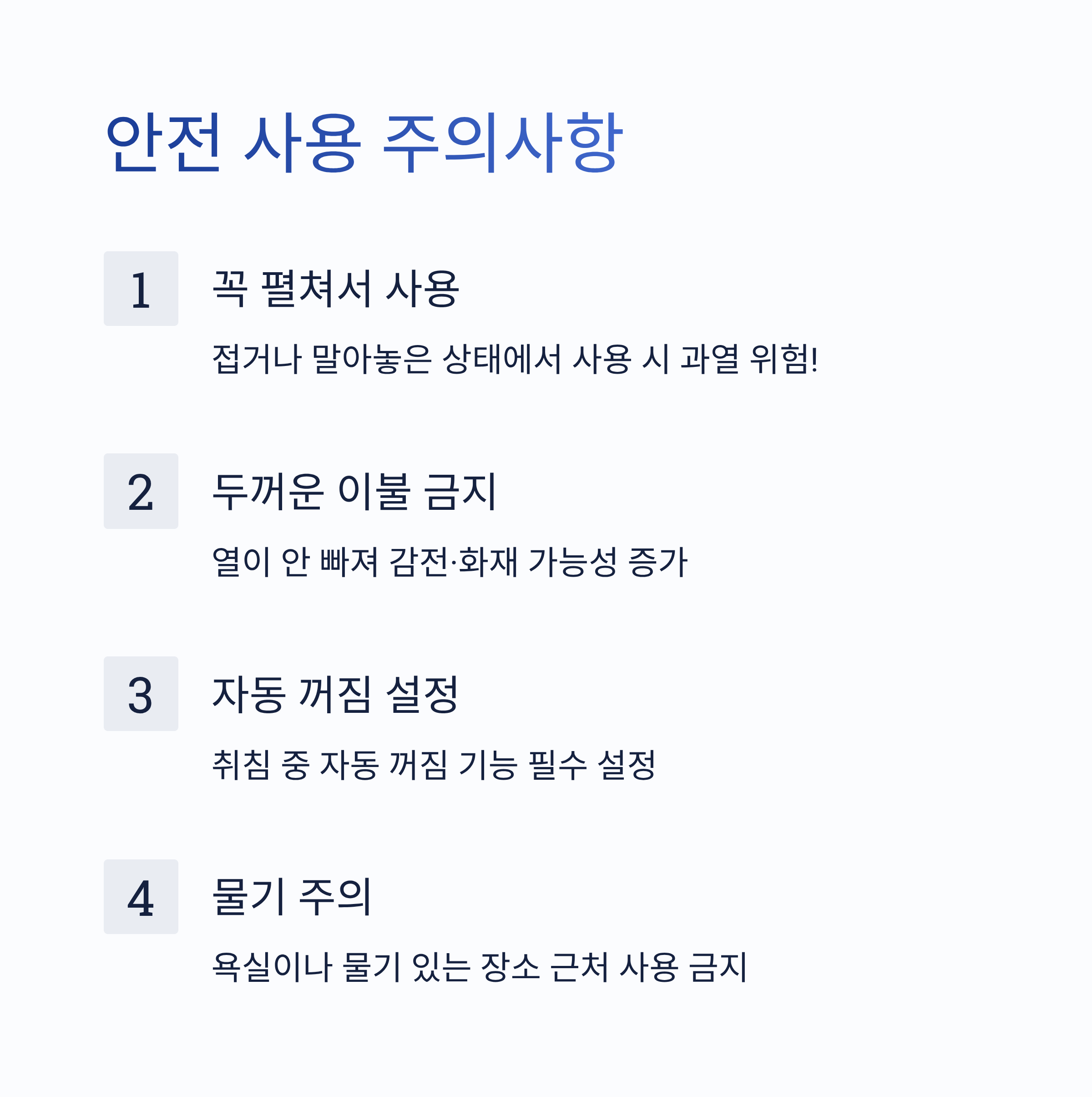 - 두꺼운 이불 덮지 않기: 열이 안 빠져 감전·화재 가능성 증가