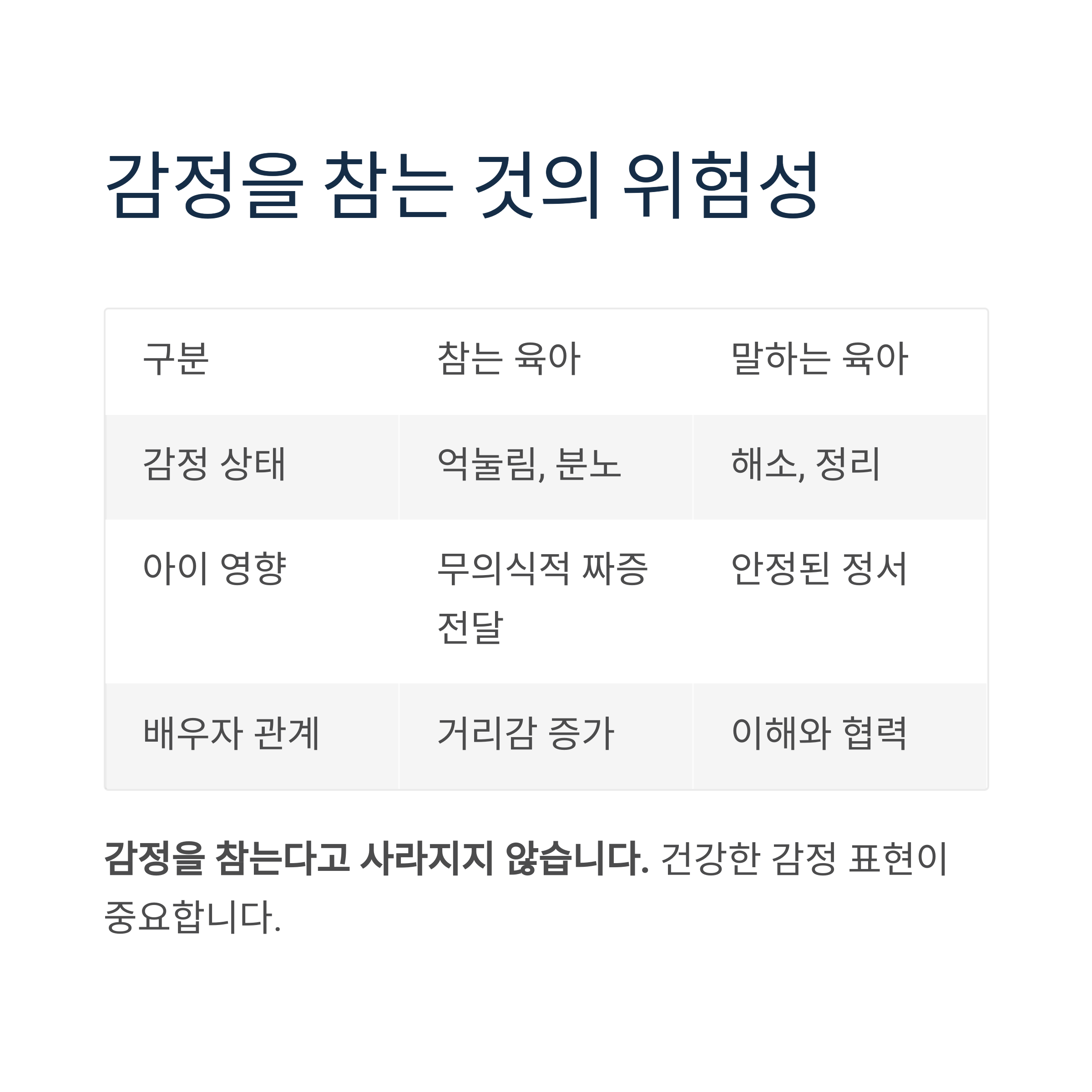 | 아이에 대한 영향 | 무의식적 짜증 전달 | 안정된 정서 |