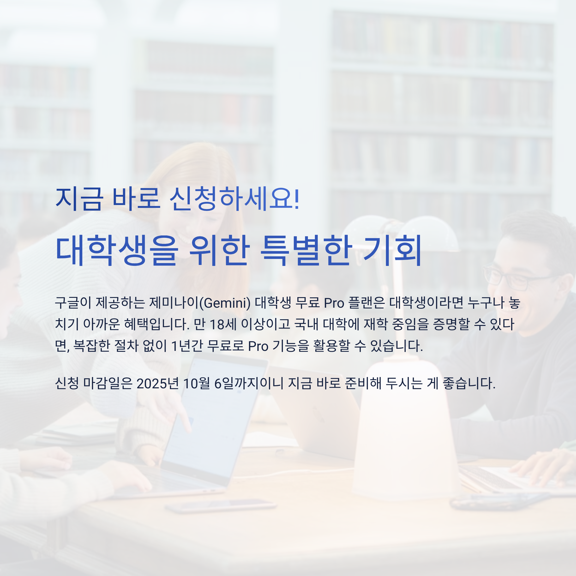 구글이 제공하는 제미나이(Gemini) 대학생 무료 Pro 플랜은 대학생이라면 누구나 놓치기 아까운 혜택입니다. 만 18세 이상이고 국내 대학에 재학 중임을 증명할 수 있다면, 복잡한 절차 없이 1년간 무료로 Pro 기능을 활용할 수 있습니다. 신청 마감일은 2025년 10월 6일까지이니 지금 바로 준비해 두시는 게 좋습니다.