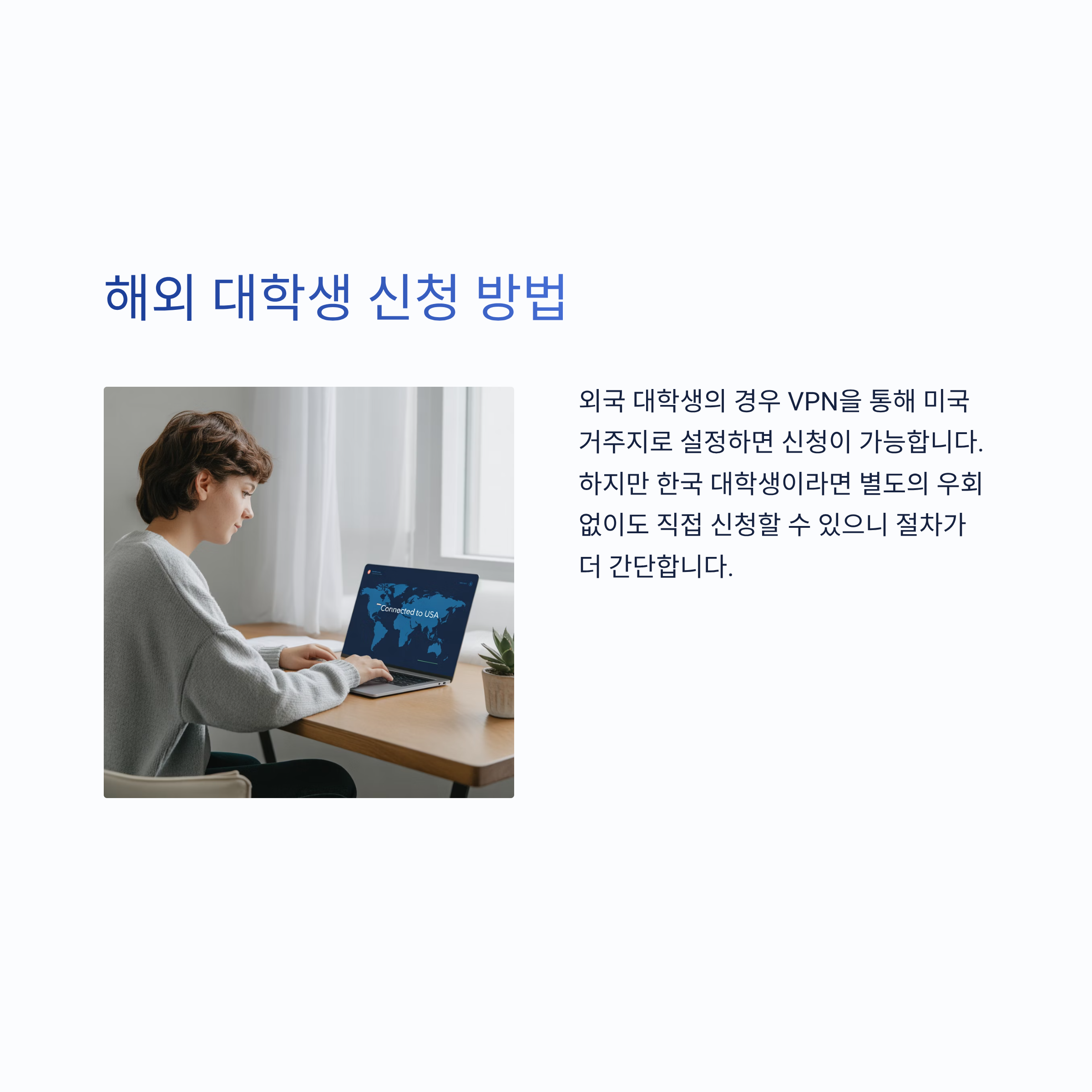 외국 대학생의 경우 VPN을 통해 미국 거주지로 설정하면 신청이 가능합니다. 하지만 한국 대학생이라면 별도의 우회 없이도 직접 신청할 수 있으니 절차가 더 간단합니다.