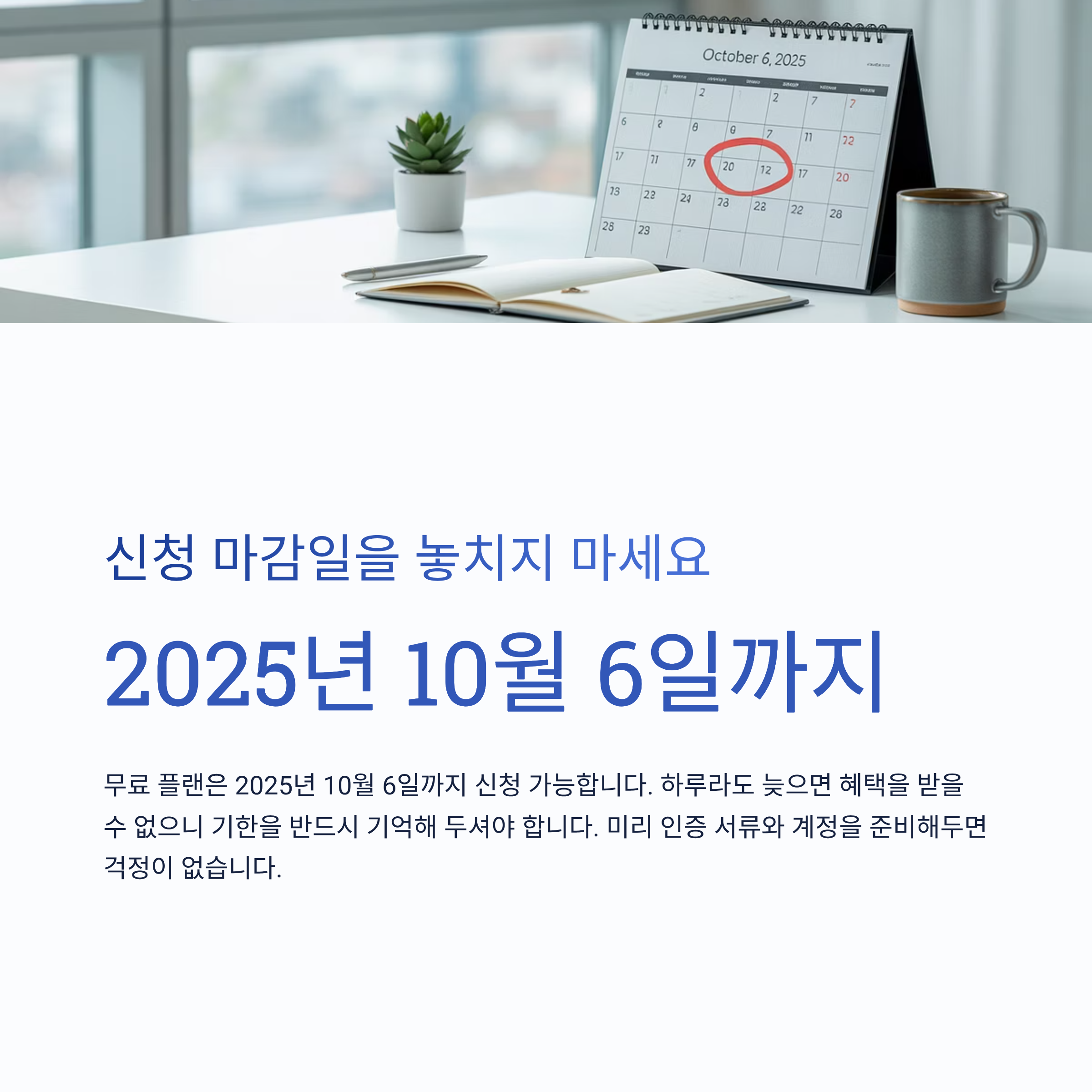 무료 플랜은 2025년 10월 6일까지 신청 가능합니다. 하루라도 늦으면 혜택을 받을 수 없으니 기한을 반드시 기억해 두셔야 합니다. 미리 인증 서류와 계정을 준비해두면 걱정이 없습니다.